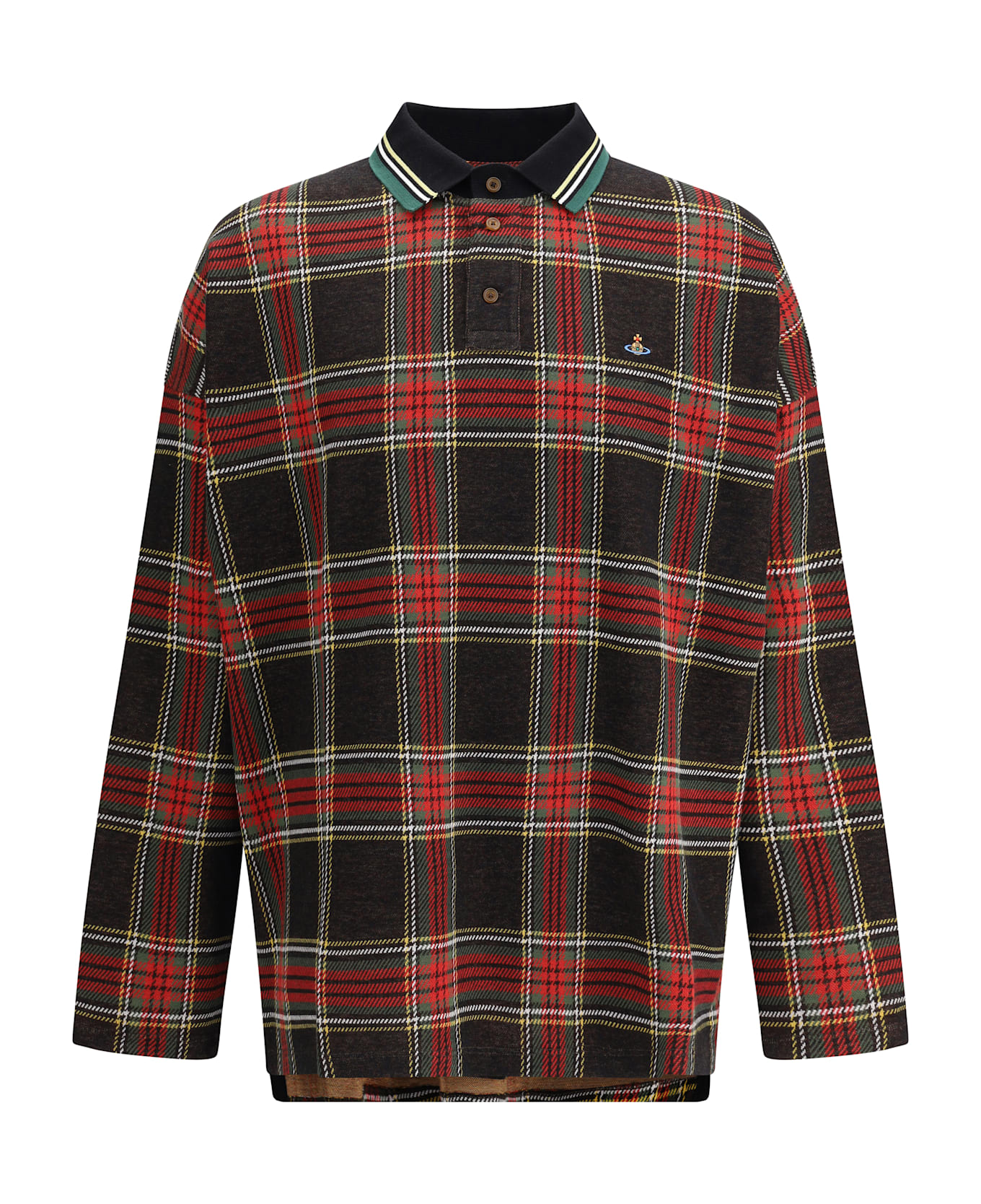 Vivienne westwood's long-sleeved cotton polo shirt combines comfort and bold style. featuring a classic collar and button closure, it features a contrasting embroidered orb logo on the front, side slits and a refined check pattern. an oversized fit completes the design for a modern, relaxed look.