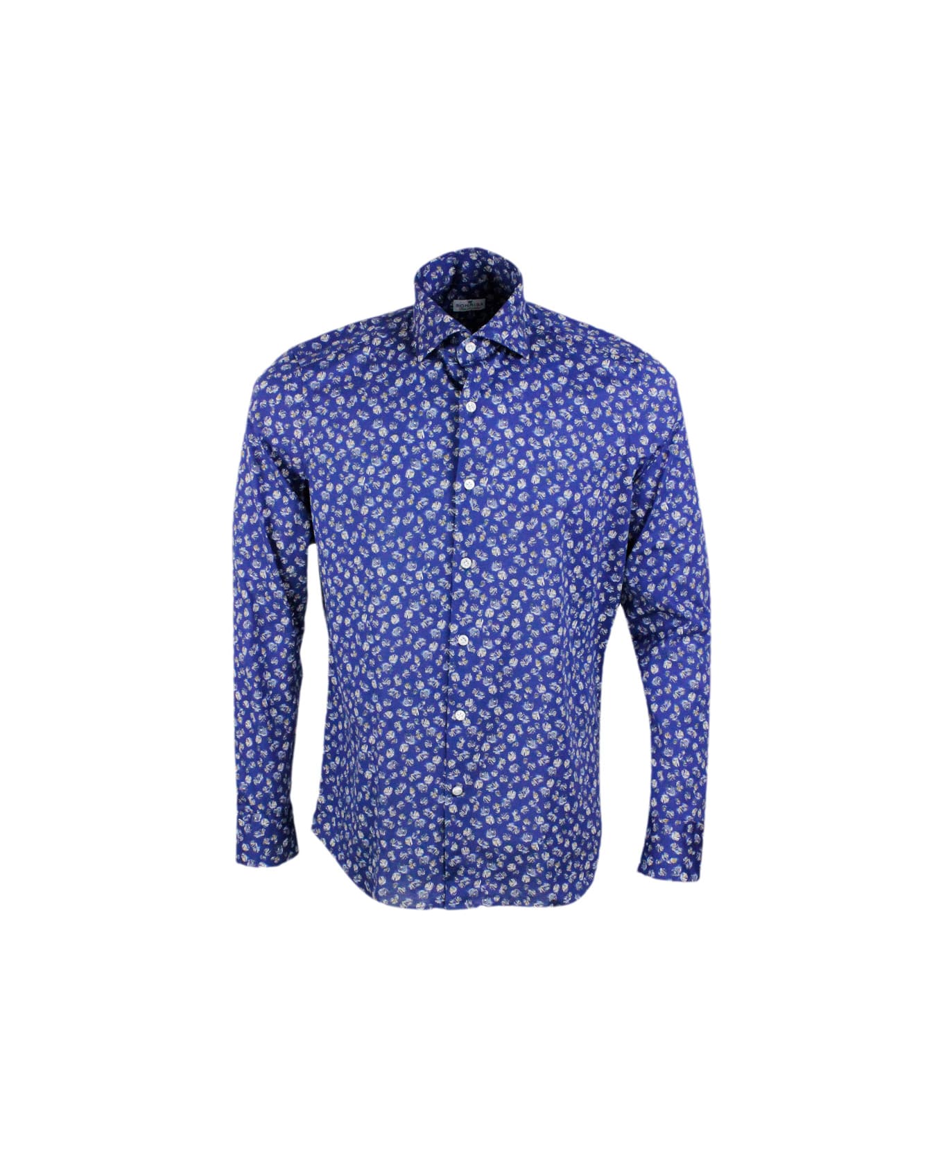 Luxury Shirt In Soft, Precious And Very Fine Stretch Cotton Flower With French Collar In Shell Patterned Print On A Blue Base