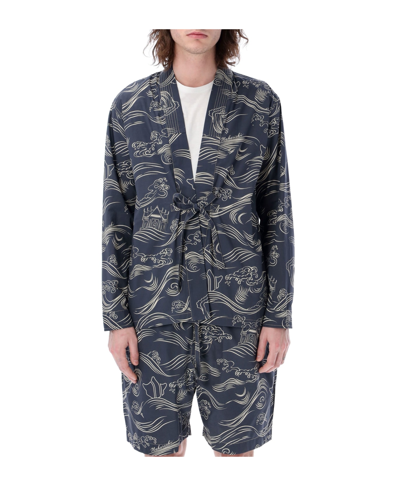 Organic Cotton Maha Songkran Hanten Kimono Shirt By Maharishi. Featuring: Triple-stitched Reinforced Kimono Collar Centre Front Tie Closure Long Sleeves Dropped Shoulders Side Seam Pockets Allover River Temple Print The Model Is 1,90 M Tall And He's Wearing Size L