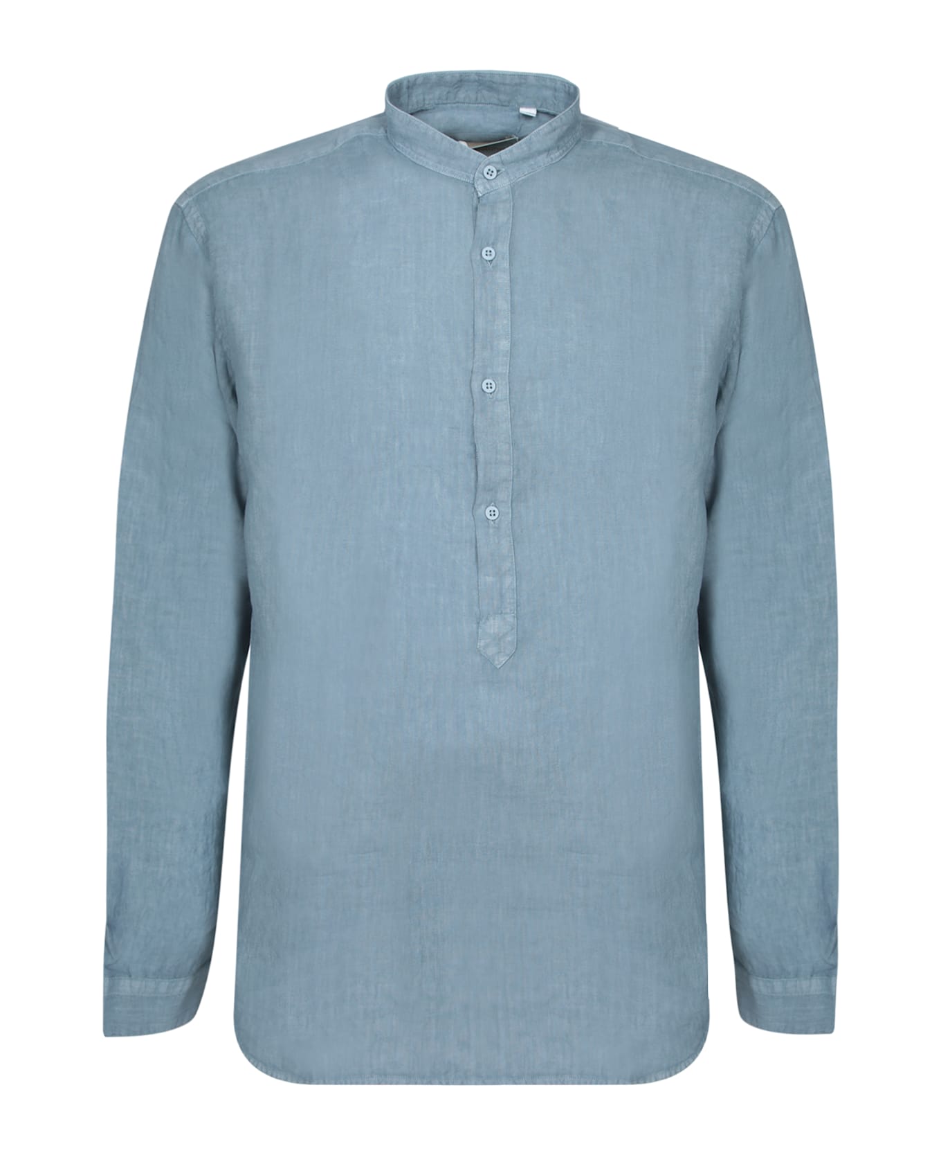 Elegant pure linen light blue shirt, ideal for a casual-chic look. Tailored details like the mandarin collar and minimalist cut enhance the fabric's natural elegance.