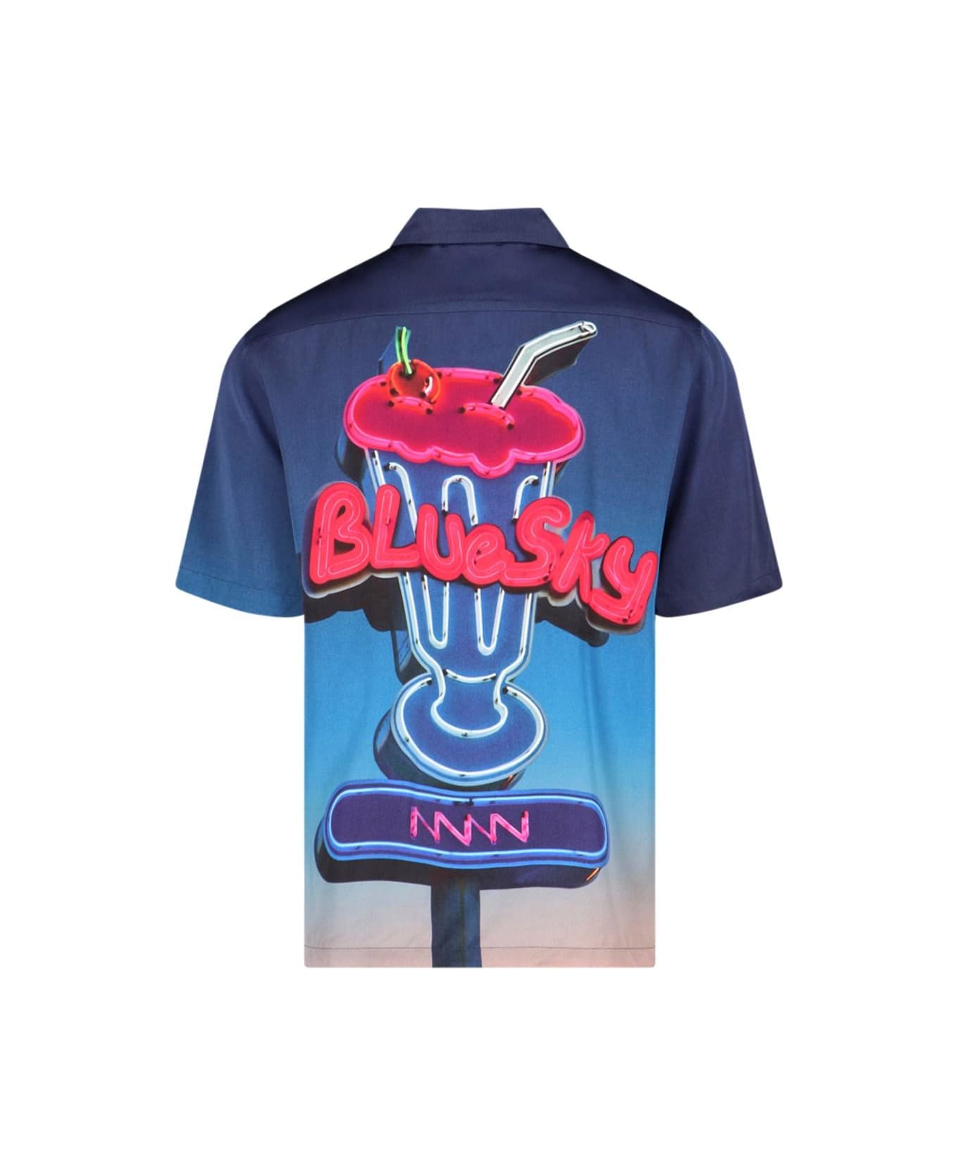 Blue Sky Inn 'Milkshake' shirt in blue fabric with graphic print with fuchsia details at the front and back, a classic collar, short sleeves, button closure, straight hem.