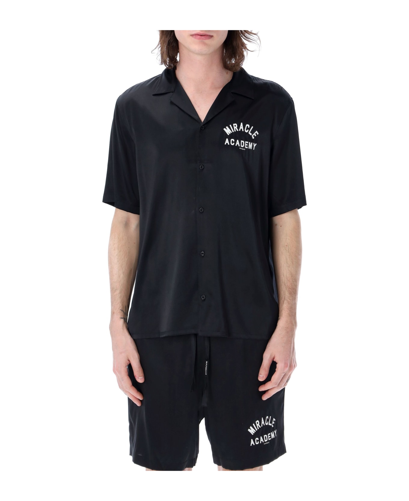 Miracle Academy Silk S/s Shirt By Nahmias. Featuring: Bowling Shirt Collar Button Closure Short Sleeves Miracle Academy Motif Printed On The Left Chest Loose Fit Model Is 1,90 M Tall And He Is Wearing Size M