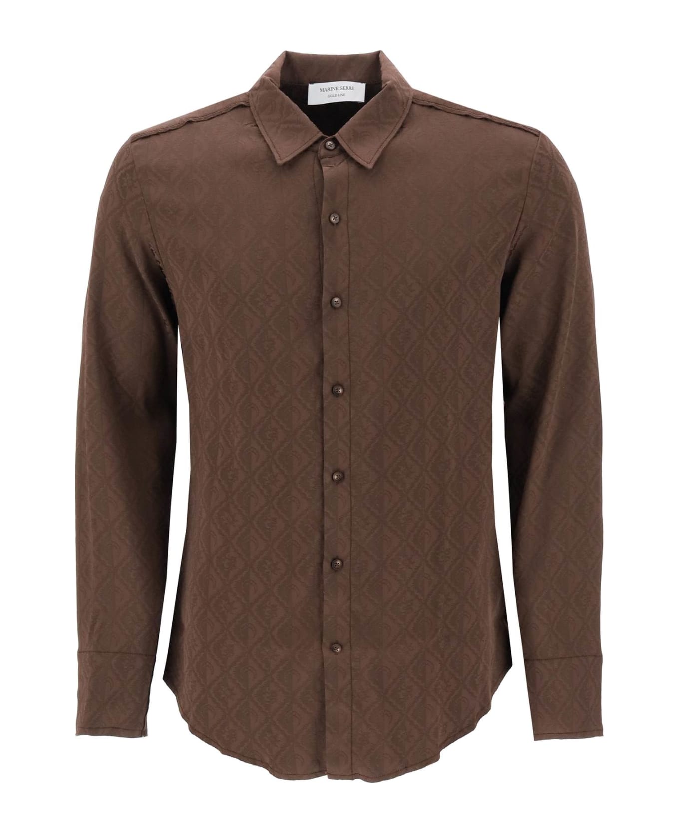 Marine Serre shirt crafted in viscose blend jacquard satin with Moon Diamant pattern all-over. Inside-out construction design featuring classic collar, front button fastening, double-button cuffs and curved hem. Finished with raw-cut edges. Loose fit. The model is 187 cm tall and wears IT 48.