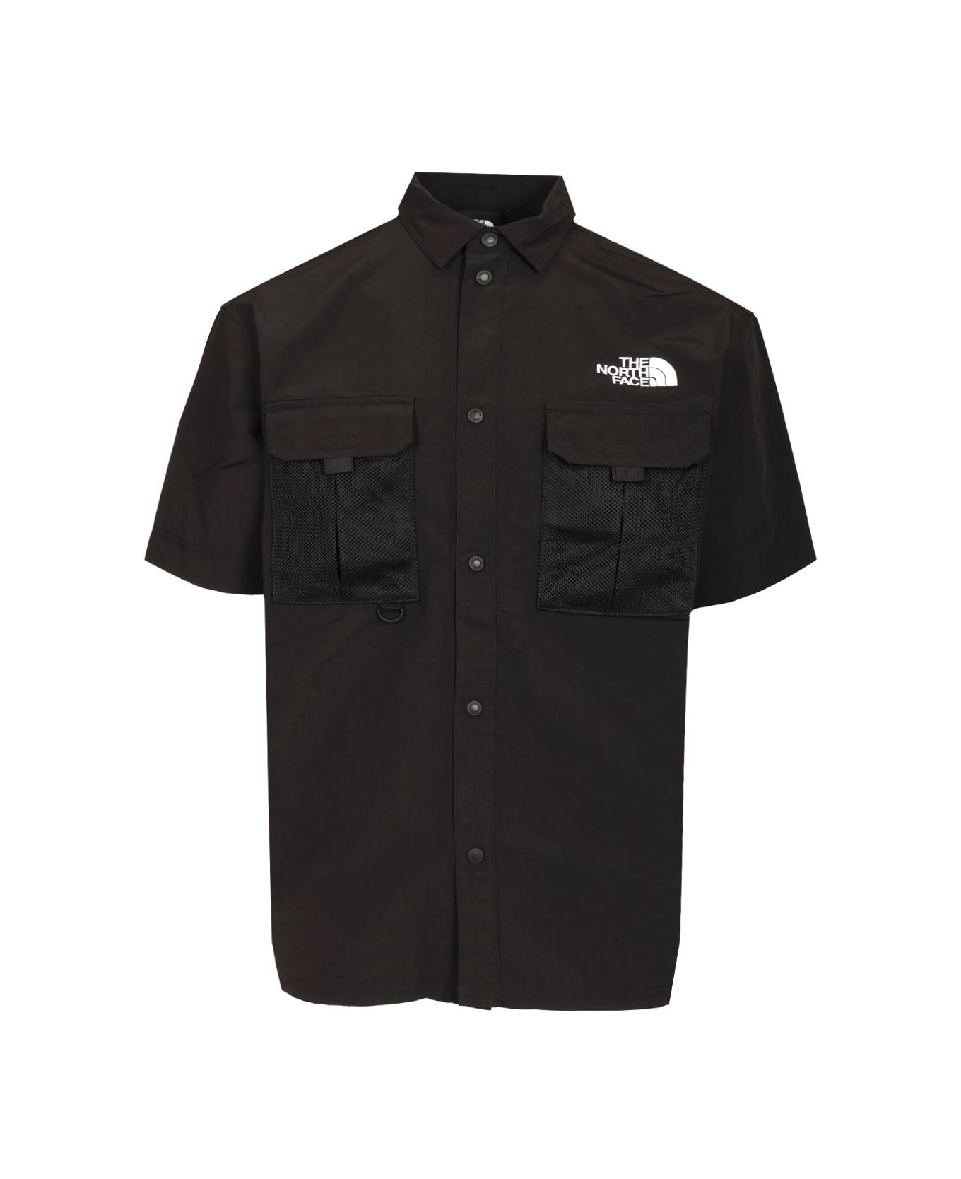 Utility shirt with embroidered logo Two-piece collar and single-stitch seams Tape labels, interior pocket with mesh overlay Chain stitching at hem, tape D-ring and buttonhole Bar tacks and snaps