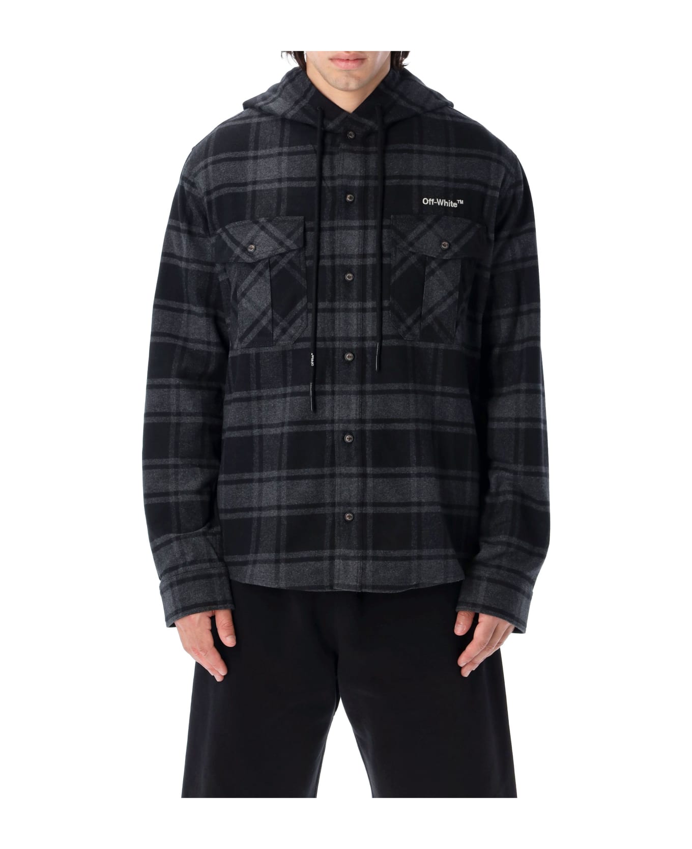 Outline Arrow Flannel Hoodie Shirt By Off White. Featuring: Check Pattern Drawstring Hood Front Button Fastening Flap Pockets At Chest Logo Embroidery At Left Chest Long Sleeves With Buttoned Cuffs Arrow Embroidery At Back Regular Fit