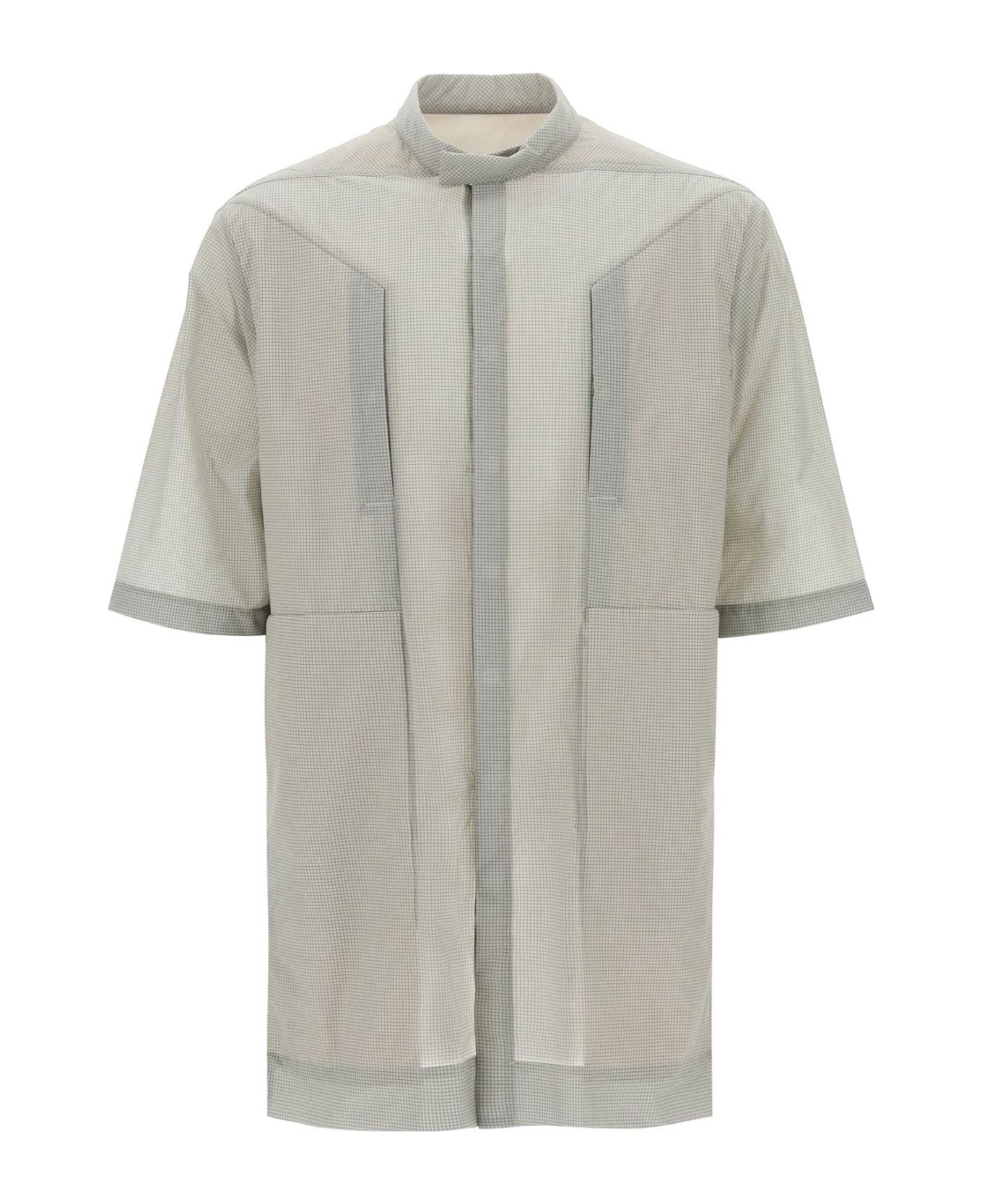 Rick Owens short-sleeved overshirt crafted in semi-sheer Ripstop nylon and Graphene with check motif all-over. It features stand collar with snap buttons, front press-stud placket and four 'Fog' pockets on the front. Unlined design with an inner pocket with zipper. Oversized fit. The model is 187 cm tall and wears size IT 48.