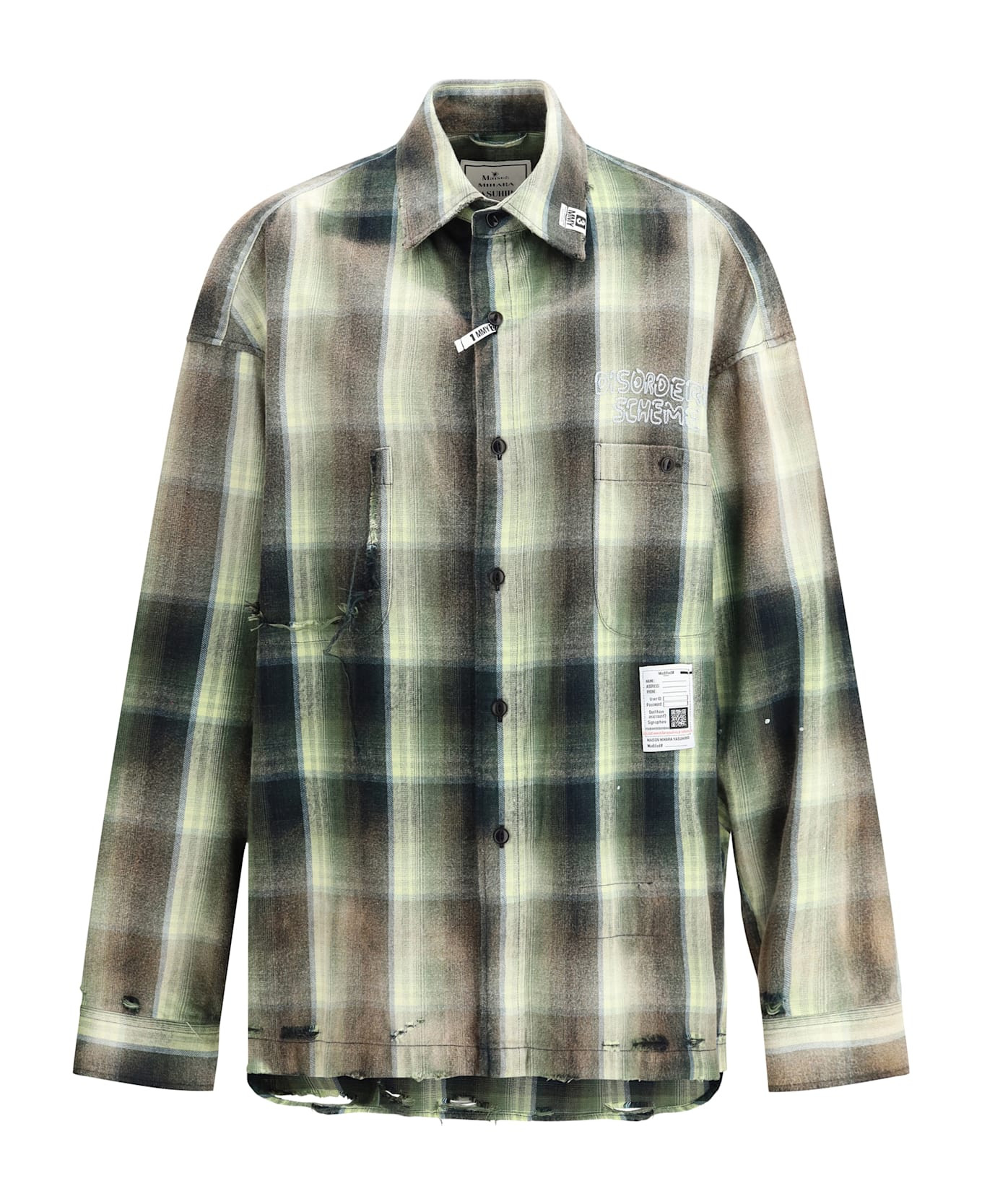 Maison mihara yasuhiro's cotton shirt combines the elegance of vintage design with a modern twist. with a classic collar and front button closure, it features a patch welt pocket and distinctive monogram patch on the front. adjustable button cuffs and embroidered lettering on the front and back enhance the garment with unique details. the vintage worn-effect design and patent patches lend a bold character, while the oversized fit ensures comfort and contemporary style.