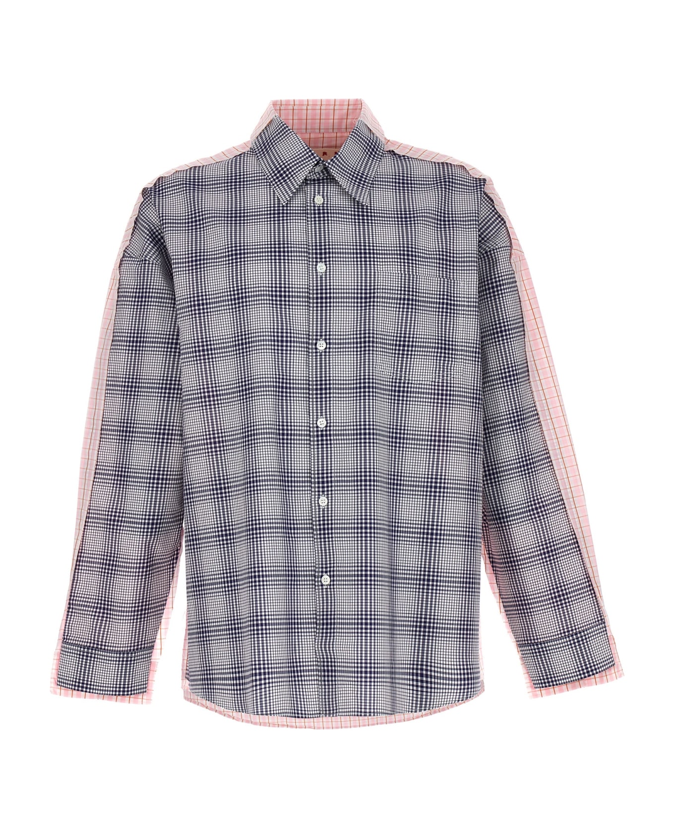 Patchwork cotton poplin shirt with front pocket, button closure, long cuffed sleeves, raw cut details. Composition: 100% cotton