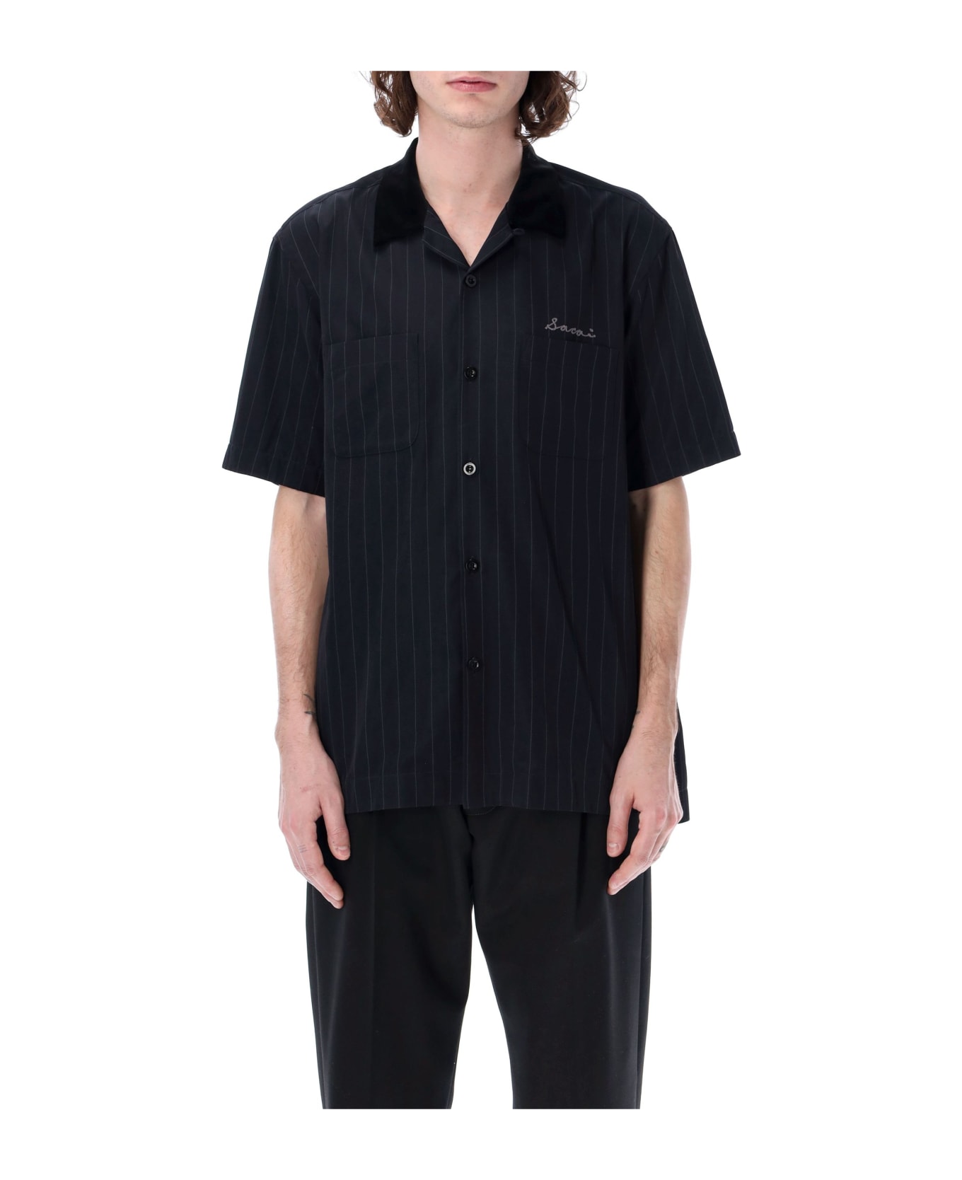 Pin Stripes Bowling Shirt By Sacai. Featuring: Velvet Collar Front Button Fastening Patch Pocket Embroidered Signature At Left Chest Short Sleeves Pin Stripes Pattern Straight Hem Model Is 1,90 M Tall And He Is Wearing Size 4