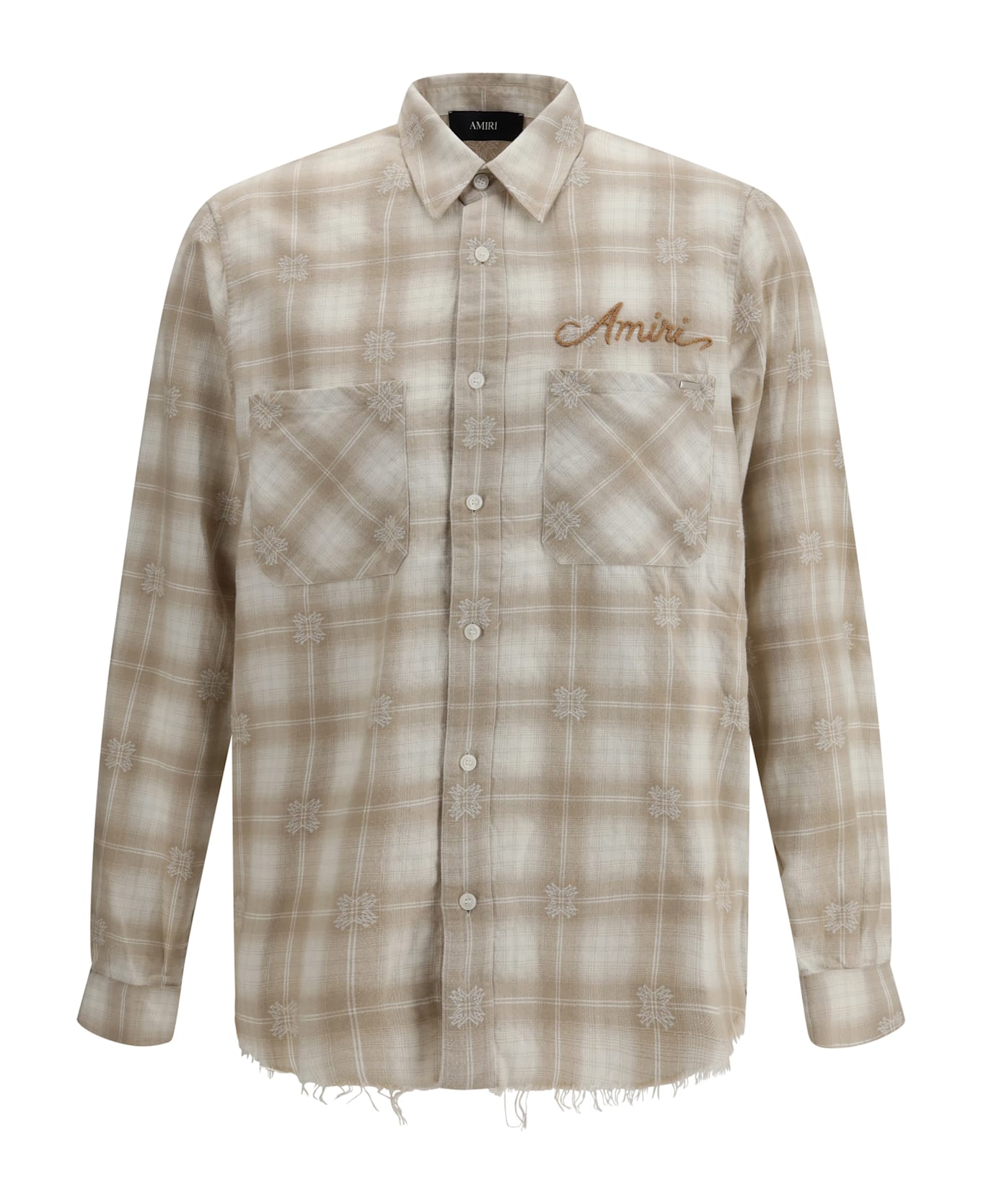 Amiri's plaid flannel shirt reinterprets a casual style classic with a bold, contemporary attitude. crafted from soft flannel, it features a classic collar and front button closure, while the two patch pockets on the front add a functional and authentic touch. the check pattern combines with the raw-cut hem for a deliberately worn effect, complemented by the embroidered logo on the front that signs the garment with the brand's unmistakable aesthetic. perfect for streetwear looks with a gritty and polished character.