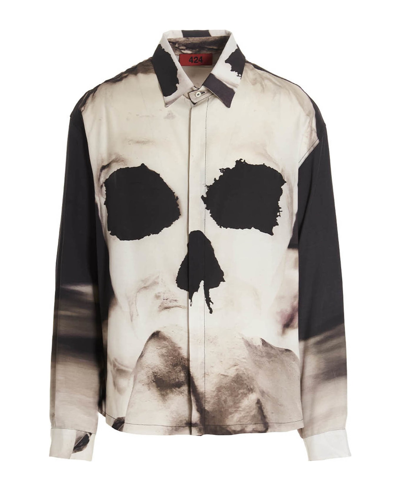 Viscose shirt with an all over print, a button closure, and long cuffed sleeves.