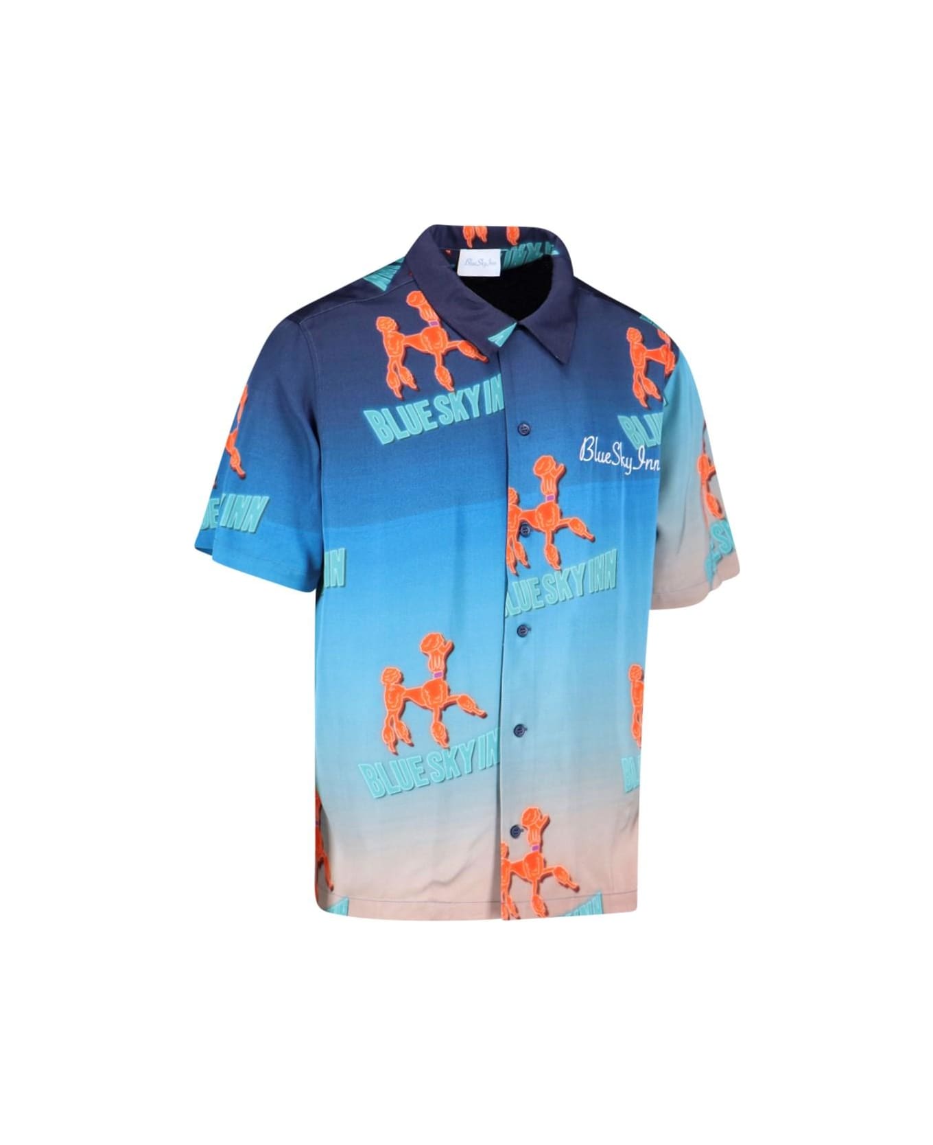 Blue Sky Inn printed shirt in light satin fabric with graphic red details, classic collar, short sleeves, a button closure, a white chest embroidered logo and straight hem.