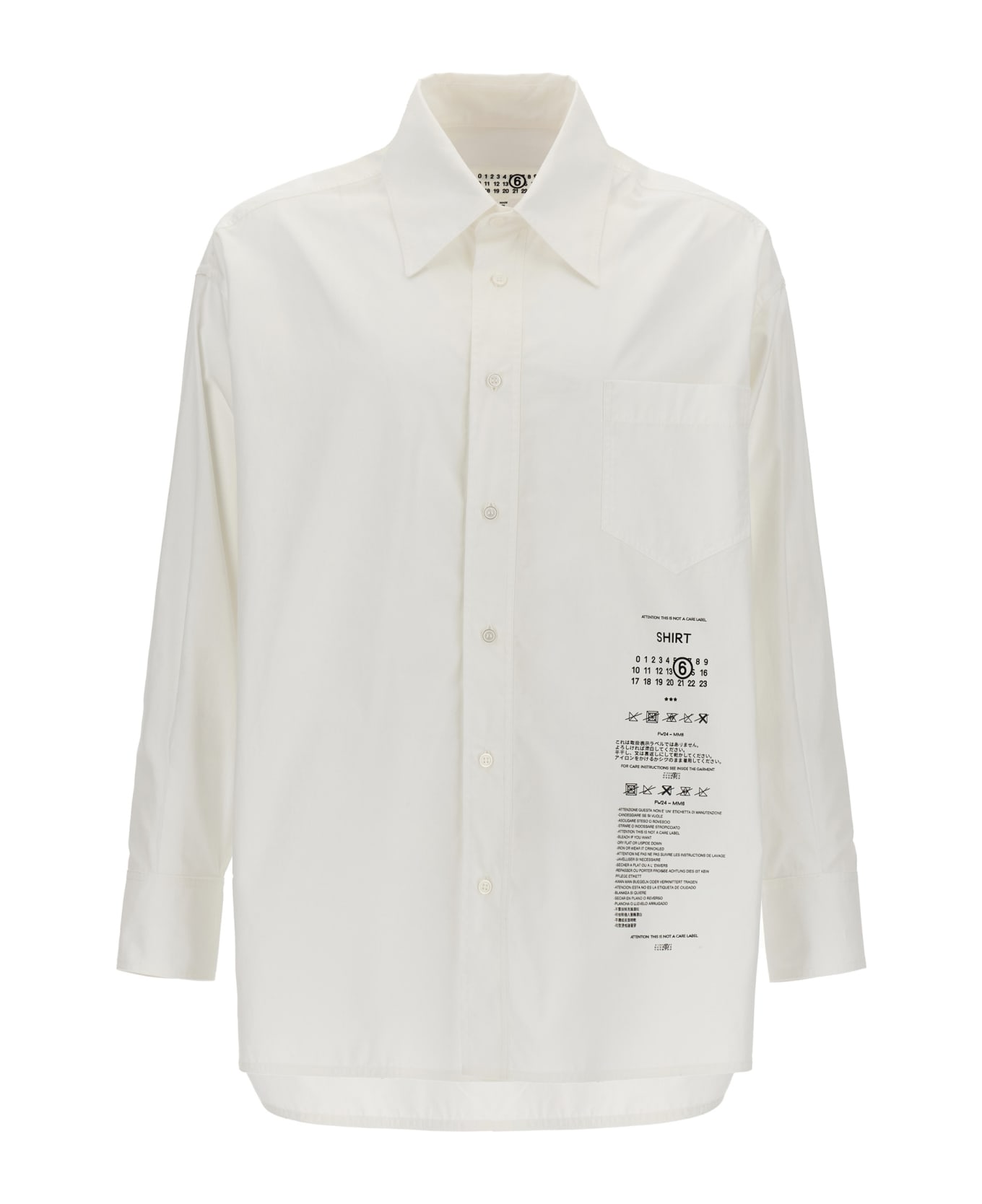 Cotton poplin shirt with printed label with front product care instructions, chest pocket, button closure, long cuffed sleeves.