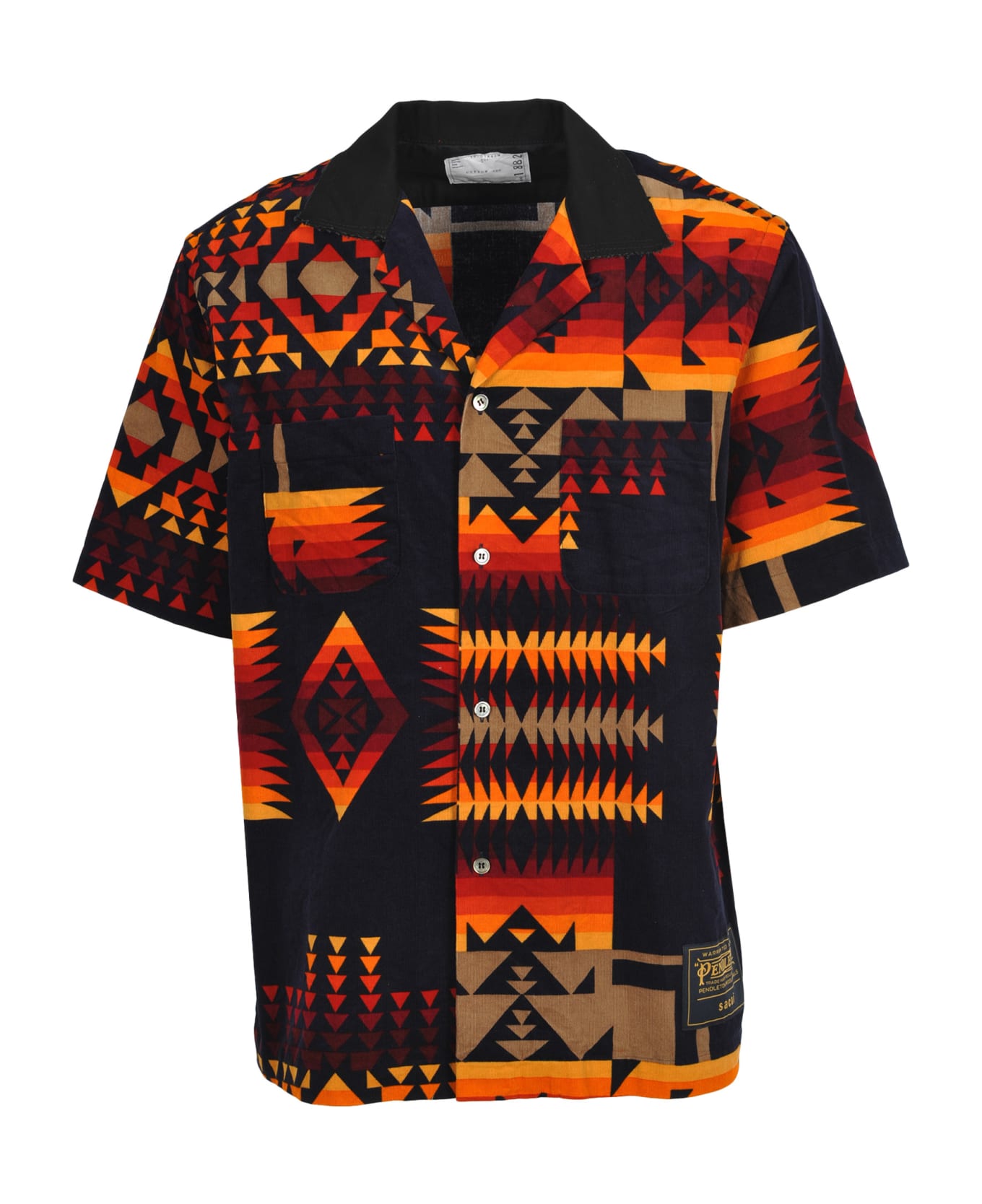 Black Cotton Pendleton Printed Shirt By Sacai. Featuring A Classic Collar, A Front Button Fastening, Chest Pockets, A Multicoloured Print, A Logo Patch At The Hem, Short Sleeves And A Straight Hem.