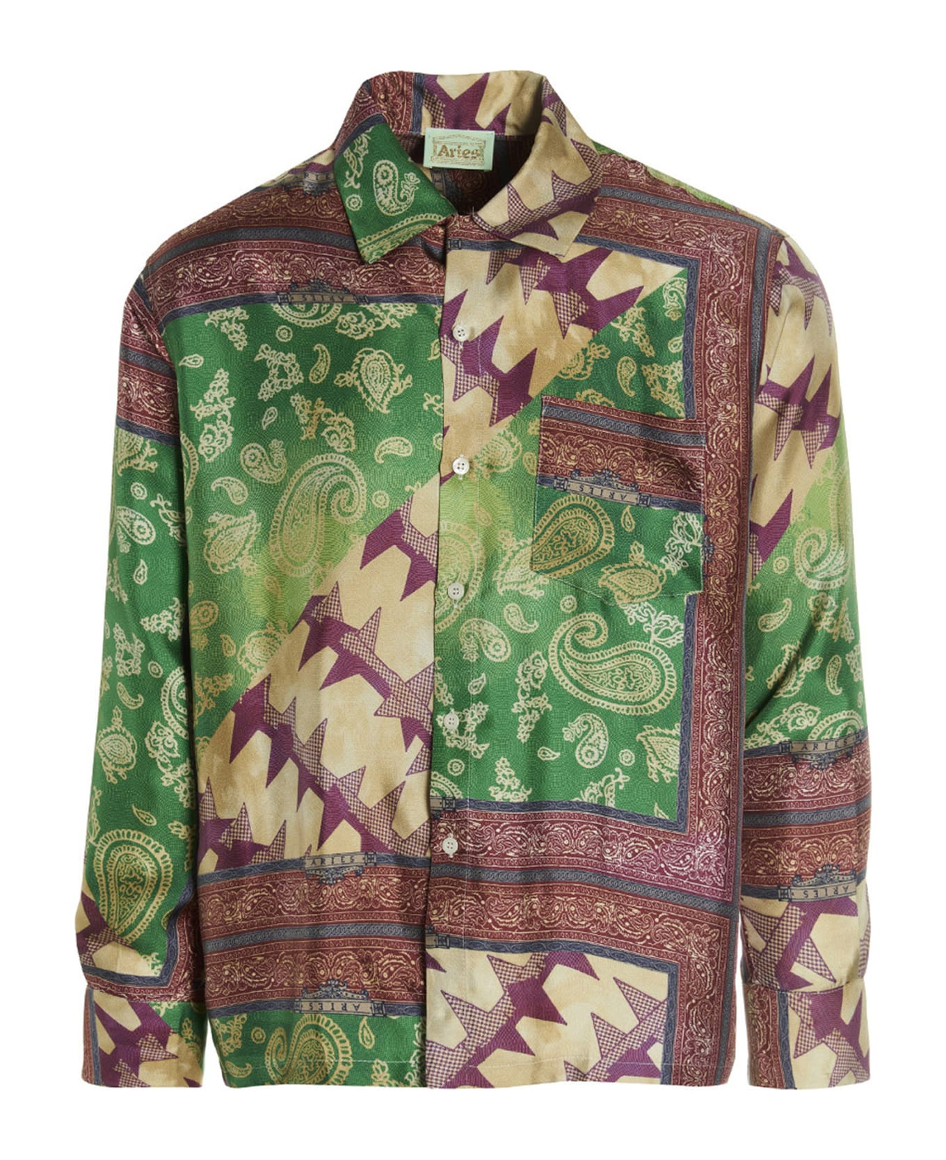 Scarg Print Silk' silk shirt with all over print, a pocket, button closure, and long cuffed sleeves.