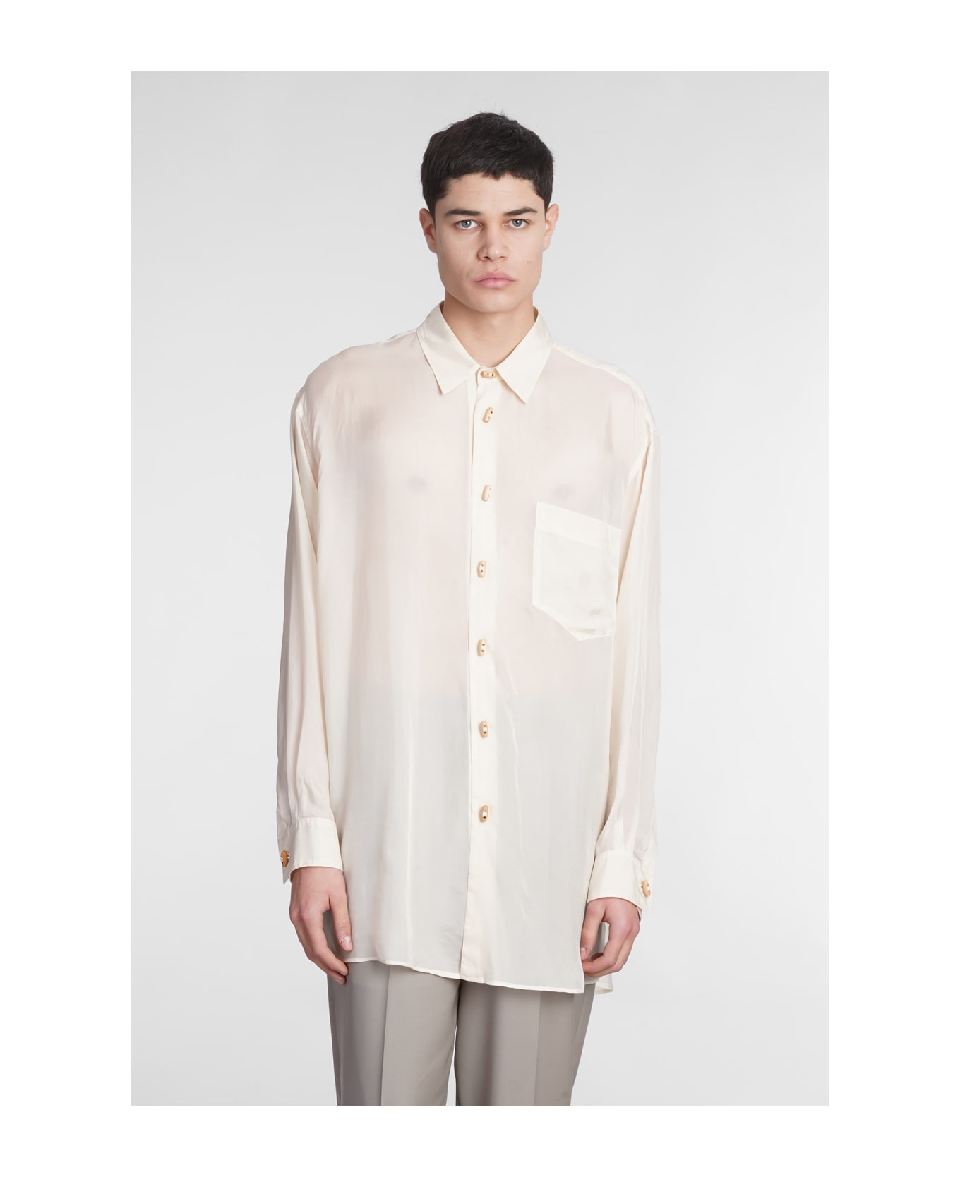 Shirt in beige polyamide polyester, collar, breast pocket, long sleeves, frontal buttoning, 100% cupro, Made in Italy, Model is 1. 83 and wears size M