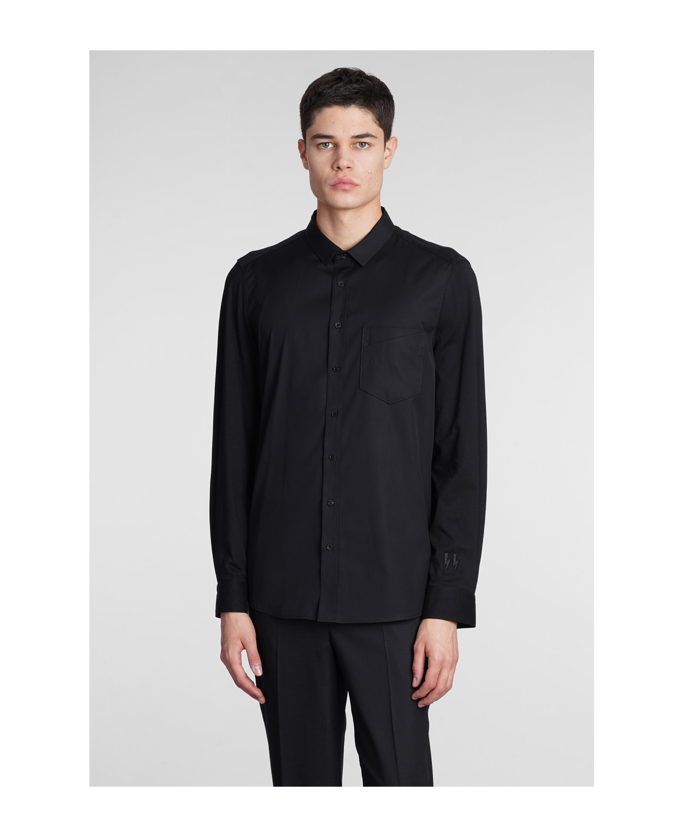 Shirt in black cotton, collar, frontal buttoning, long sleeves, 100% cotton, Made in Turkey, Model is 1. 83 and wears size M