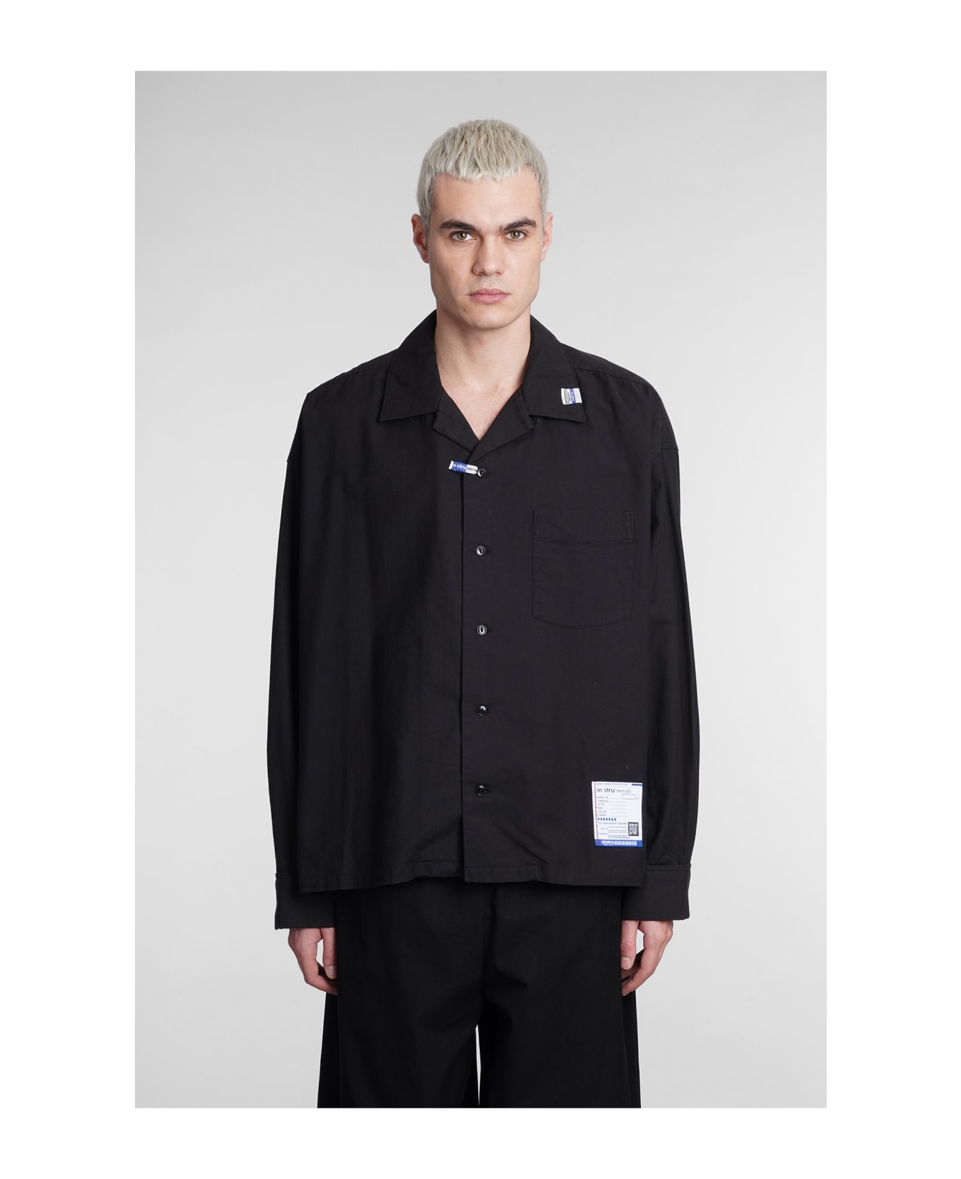Shirt in black cotton, bowling neck, frontal buttoning, long sleeves, frontal patch logo, Made in Japan, 100% cotton, Model is 1. 83 and wears size 46