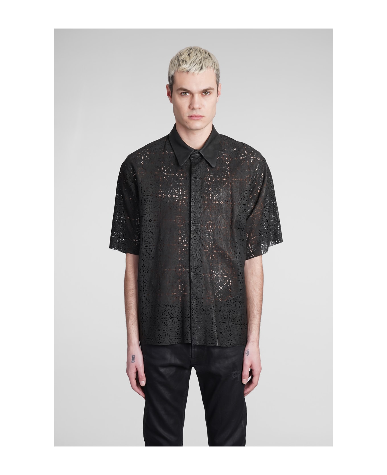 Shirt in black leather, collar, frontal buttoning, short sleeves, perfored details, 100% sheep, Model is 183 cm and wears 48 , Made in Italy