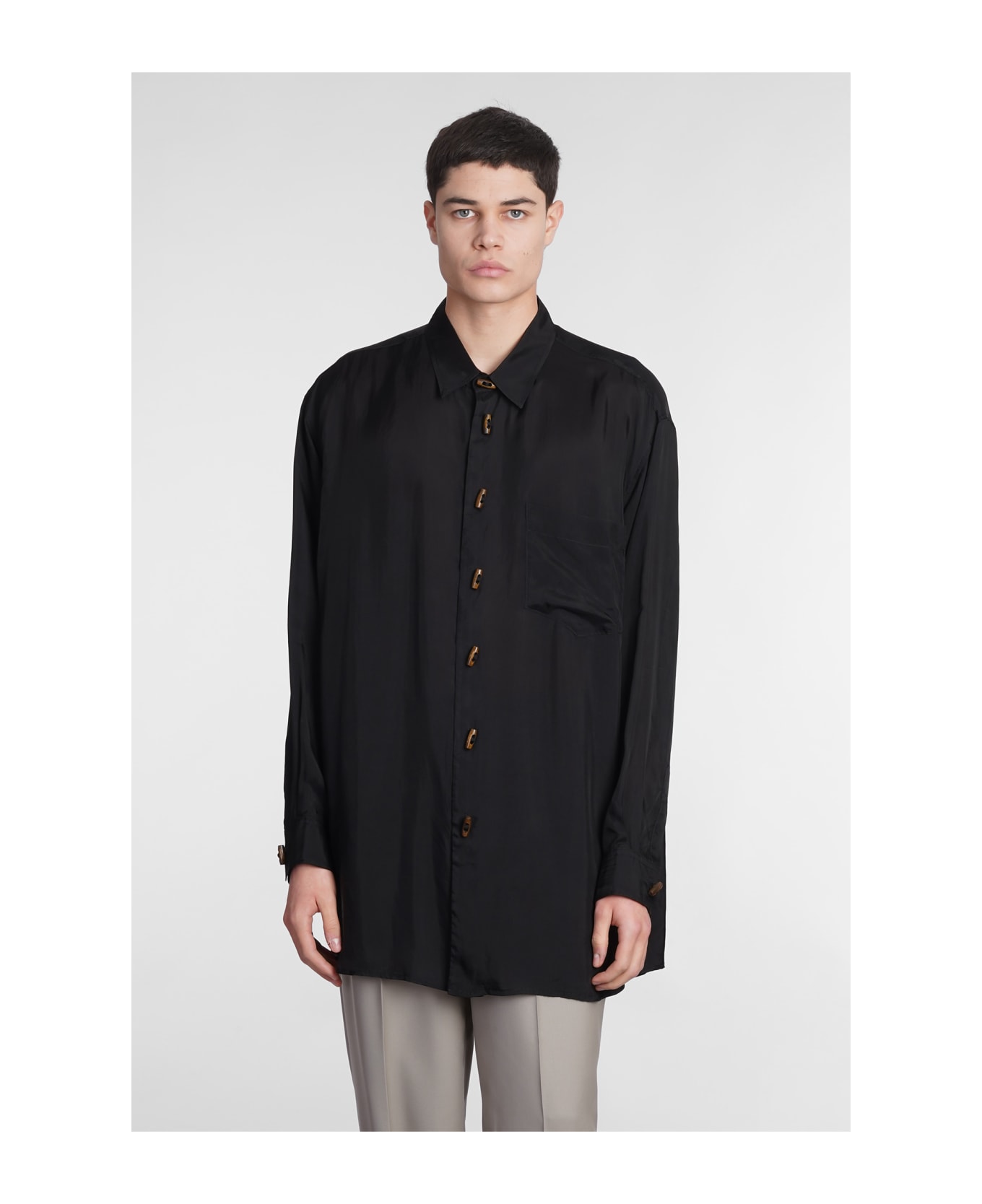 Shirt in black polyamide polyester, collar, breast pocket, long sleeves, frontal buttoning, 100% cupro, Made in Italy, Model is 1. 83 and wears size M