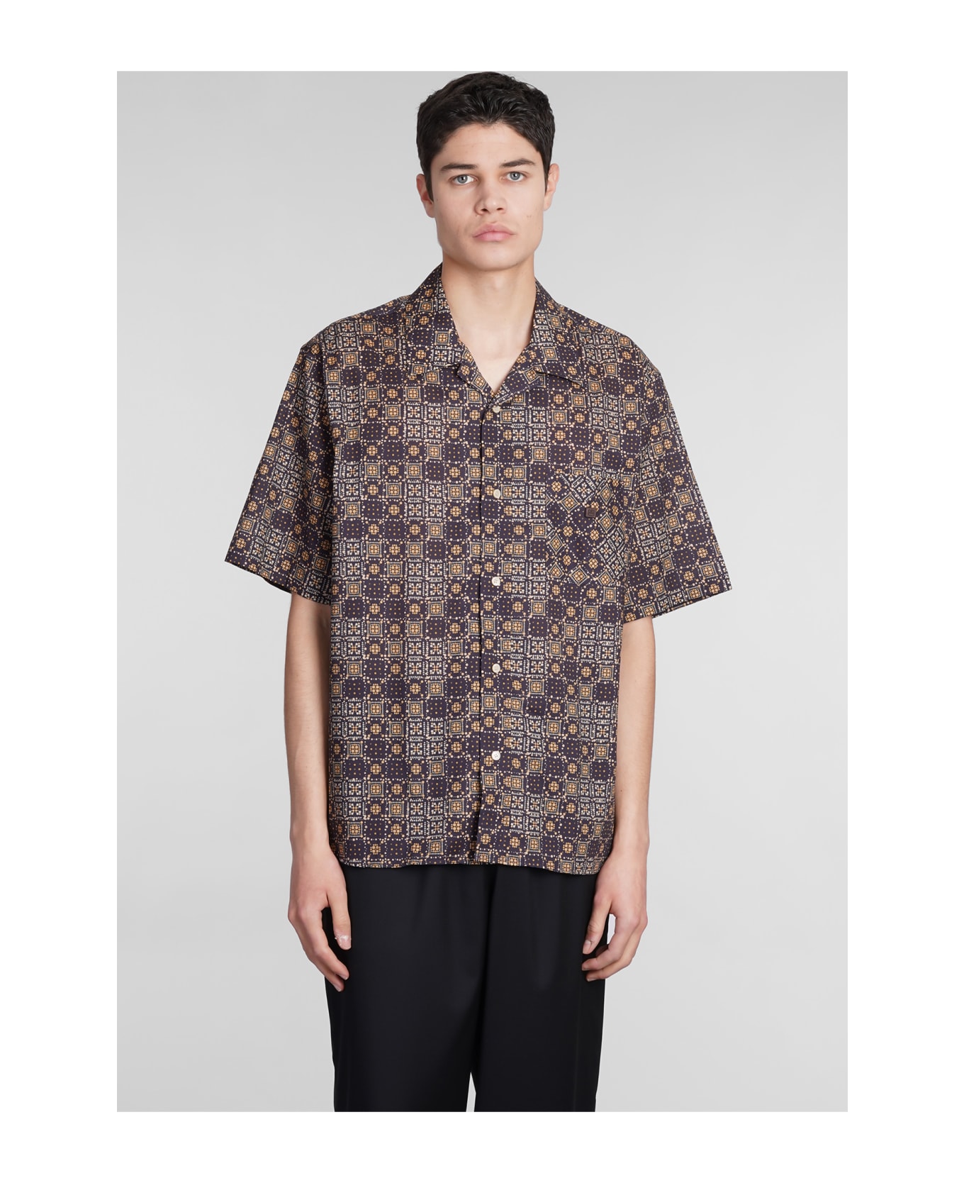 Shirt in brown cotton, bowling neck, frontal buttoning, short sleeves, breast pocket, jacquard print, 100% cotton, Made in Morocco, Model is 1. 83 and wears size M