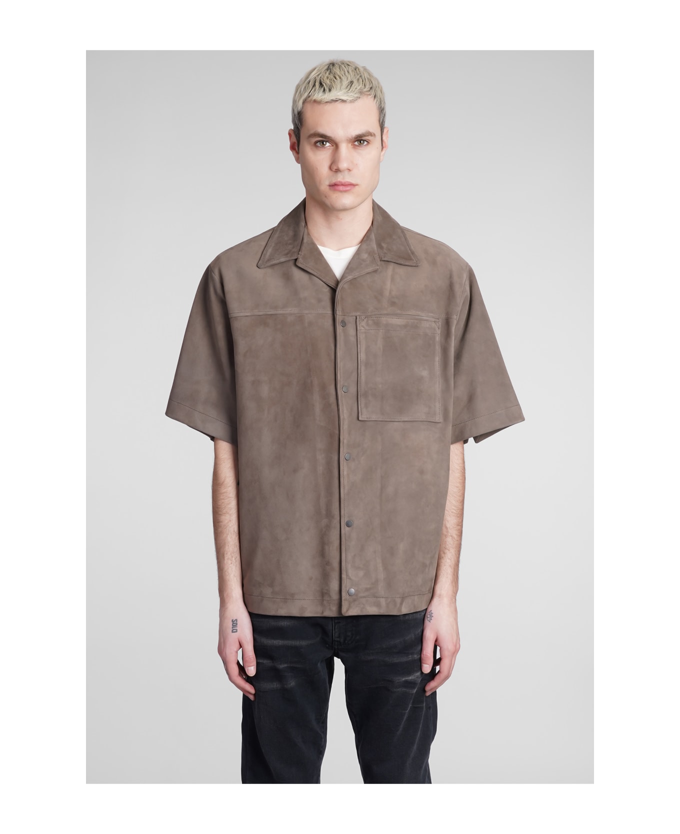 Shirt in brown leather, collar, pockets, frontal buttoning, short sleeves, 100% sheep, Model is 183 cm and wears 48 , Made in Italy