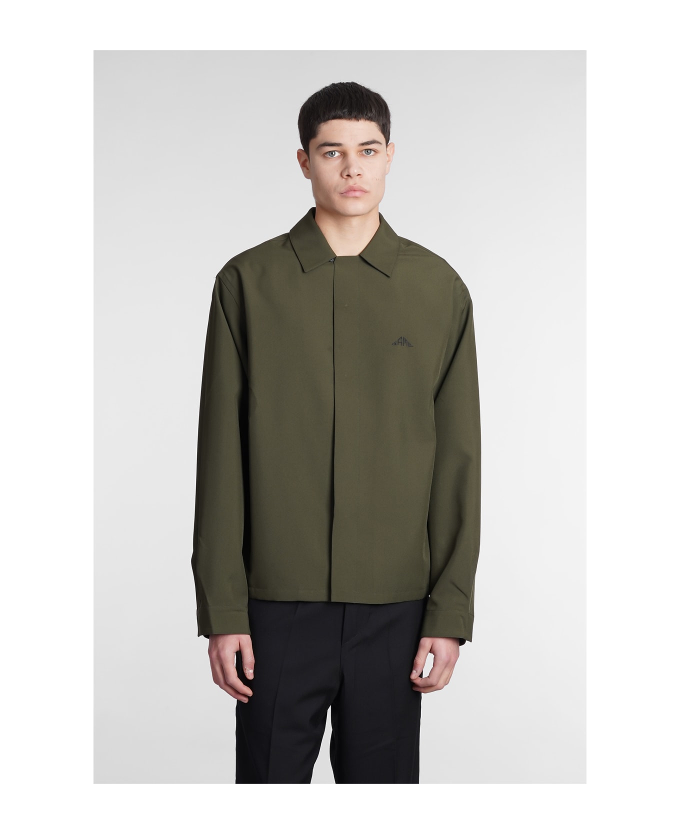 Shirt in green polyester, collar, long sleeves, frontal buttoning, pockets, logo print back, 100% polyester, Model is 1. 83 and wears size M