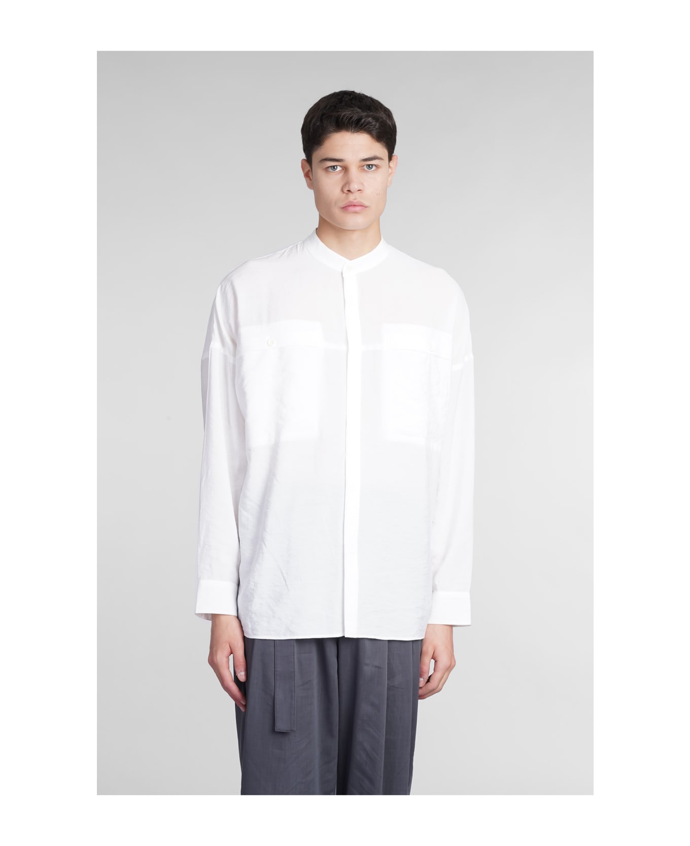 Shirt in white nylon, mao collar, flap pockets, frontal buttoning, long sleeves, Made in China, Model is 1. 83 and wears size 2