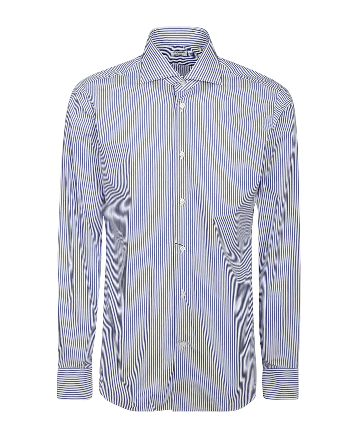 Borriello White cotton shirt, blue striped pattern, French collar, mother-of-pearl buttons, buttoned cuffs, slim fit.