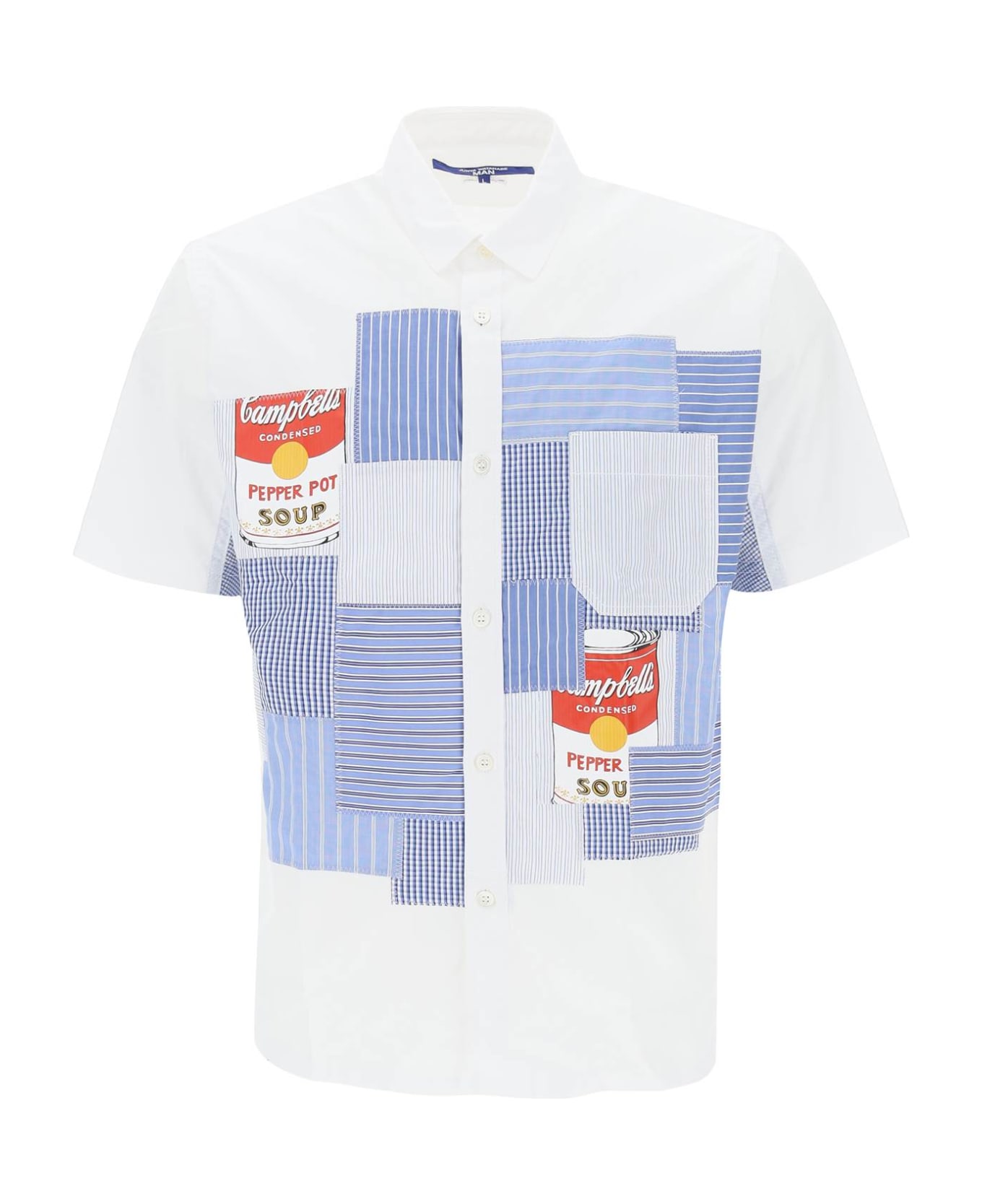 Short-sleeved cotton shirt from Junya Watanabe Man, embellished with contrast shirting patches for a patchwork effect. It features a small collar, a button placket and a chest pocket. Side vents with dropped back hem. The model is 187 cm tall and wears a size L.
