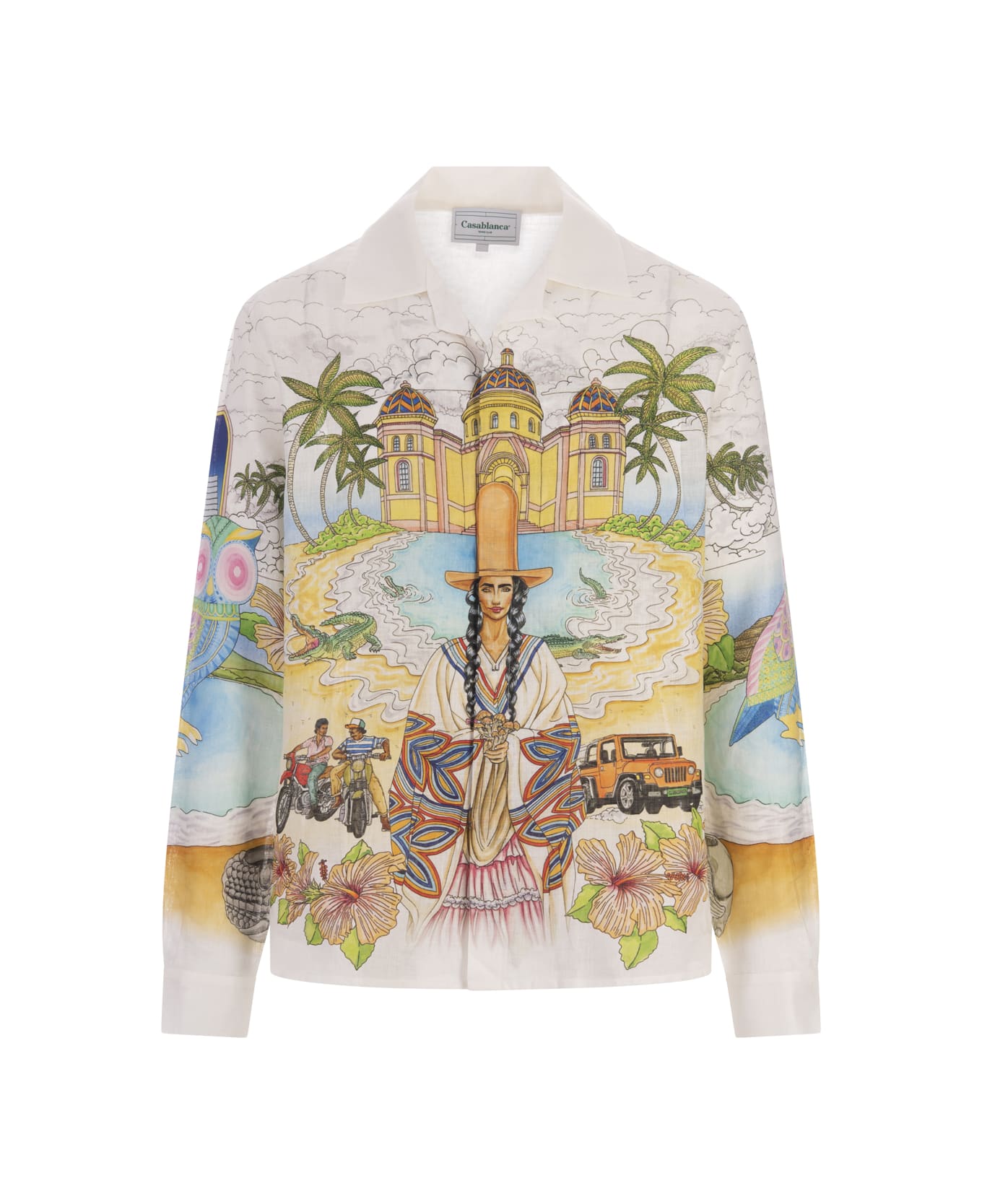 Spirit Lake shirt by Casablanca made of white linen with a printed style featuring an effervescent interpretation of an evocative landscape scene inspired by Mexican artist Pedro Linares, fantastical creatures depicted in kaleidoscopic colors are a form of spiritual animals. Designed with a Cuban collar, long sleeves, a Casablanca Paris branded label, a front button closure, and mother-of-pearl buttons with a gold-tone border designed for a comfortable fit. Fits true to size, take your regular size.