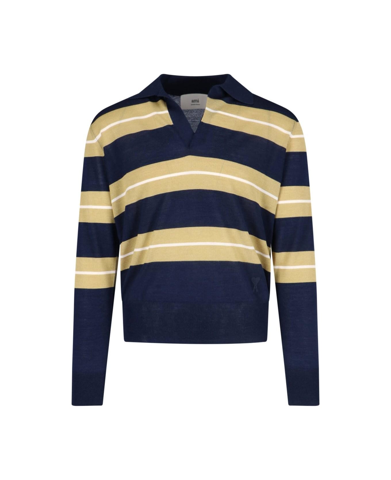 Ami striped polo shirt in blue wool and silk with beige and white stripe pattern, classic collar, long sleeves, tone-on-tone 'Ami de C ur' logo embroidery on the side, ribbed trim, straight hem. 70% wool, 30% silk