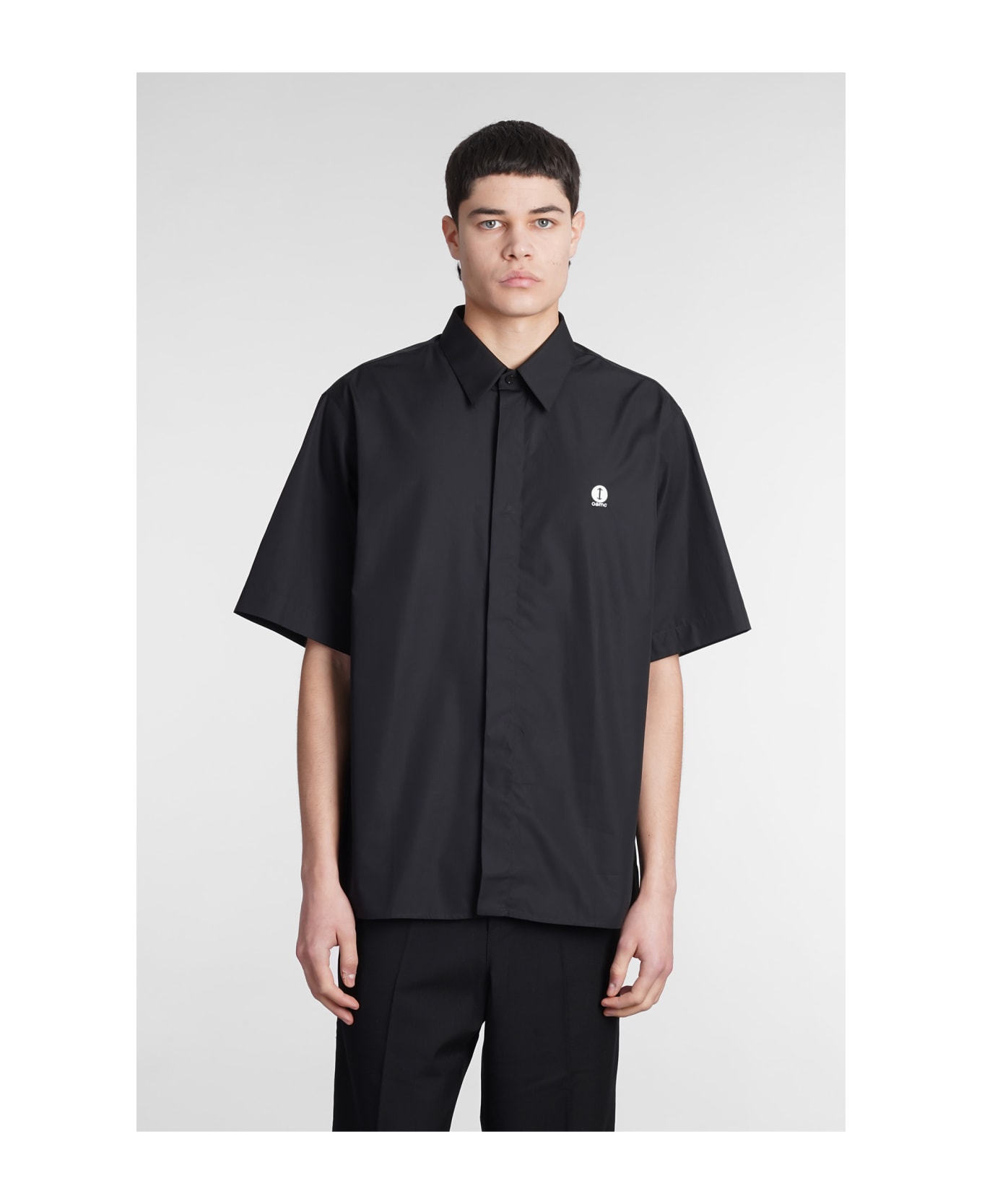 Studio Shirt in black cotton, short sleeves, frontal buttoning, collar, logo print back, 100% cotton, Made in Romania, Model is 1. 83 and wears size M
