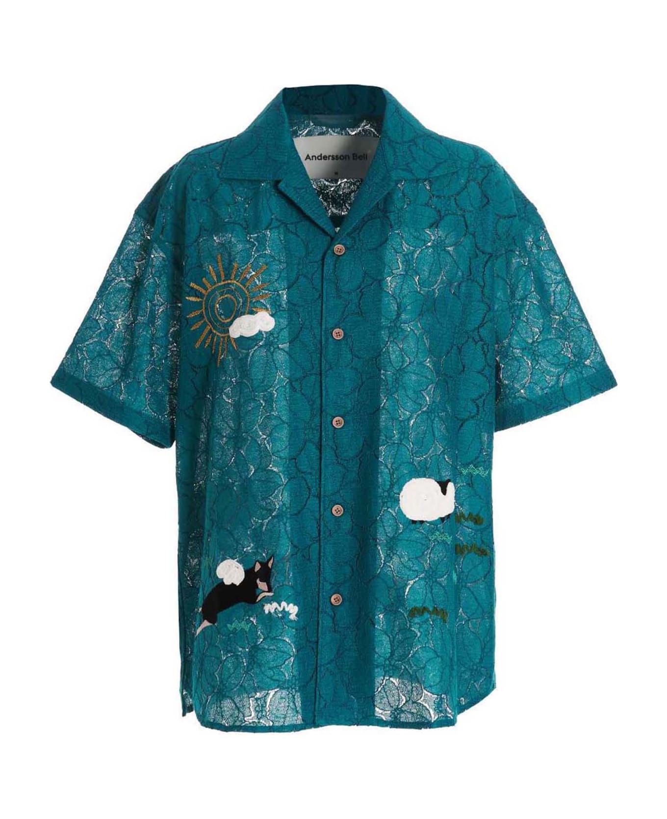 Summer Garden' cotton blend lace shirt with all-over embroideries, a button closure, and short sleeves.
