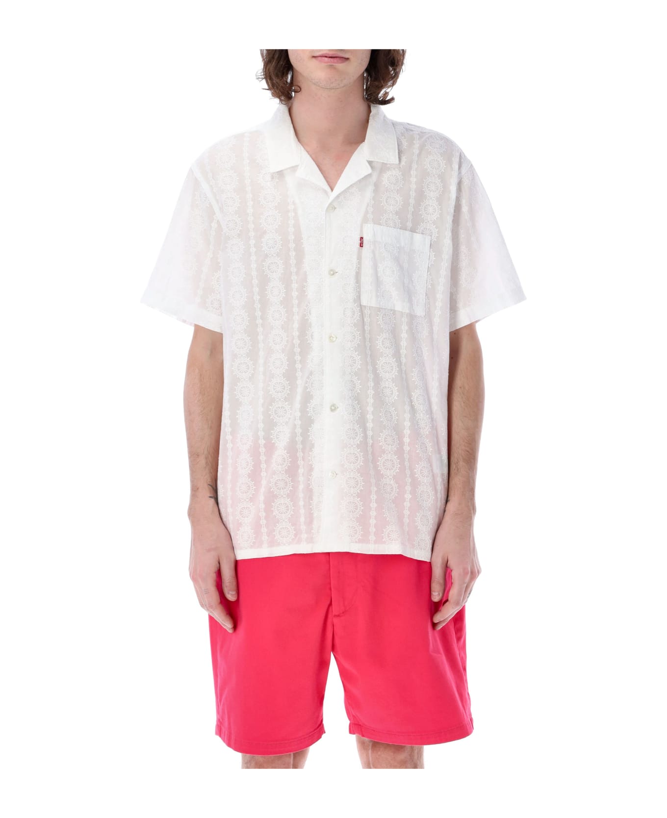 Cotton Sunset Camp Shirt By Levi's 501 Red Tab. Featuring: Lightweight And Breathable Camp Shirt Roomy Fit Bowling Shirt Collar Button Fastening Patch Pocket At Chest Short Sleeves All-over Tonal Embroidery Straight Hem Model Is 1,90 M Tall And He Is Wearing Size L