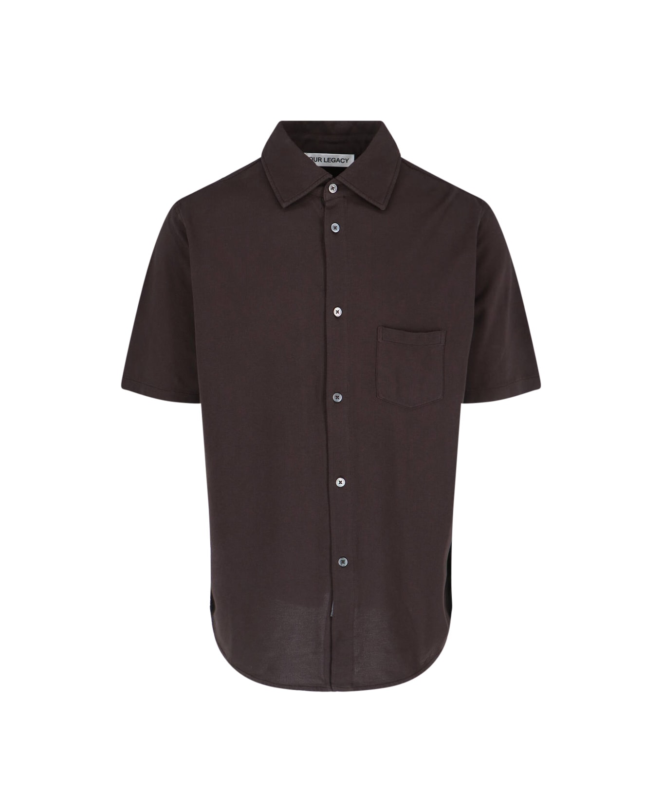 Our Legacy Super Mall shirt in brown cotton with classic collar, short sleeves, button closure, chest pocket, curved hem.