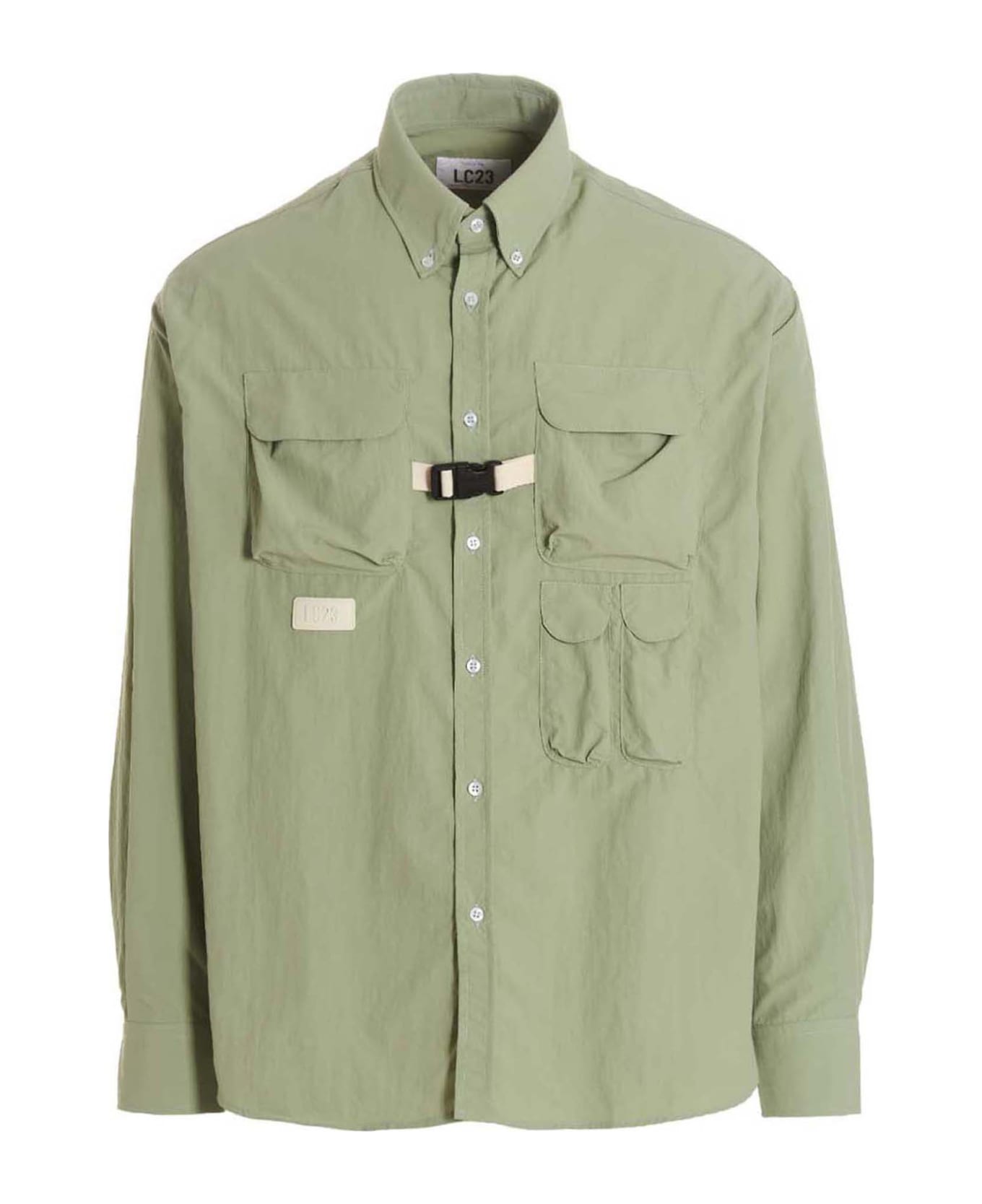 Tech fabric shirt with button closure, buckle detail, pockets and front logo patch.