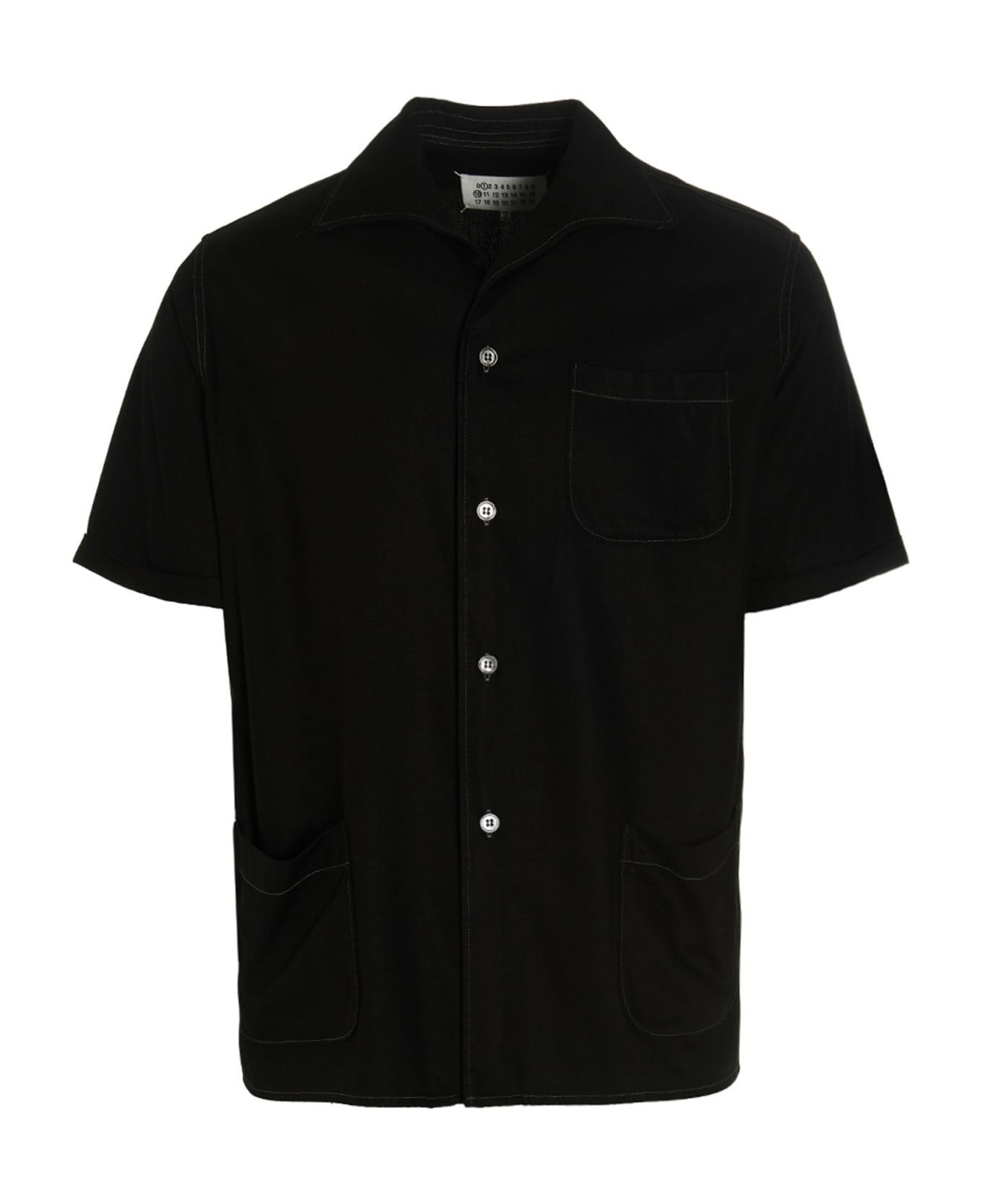Rayon twill shirt with three pockets, short sleeves, button closure, contrast stitching. Composition: