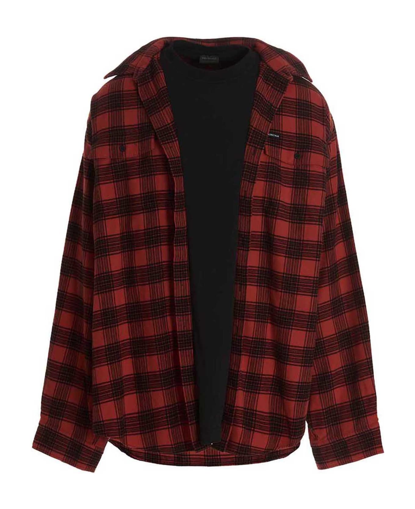 Trompe l'oeil' oversize red and black checked flannel shirt and a black vintage jersey, consisting of two fabric panels united, flap pockets with button on the chest, long cuffed sleeves, asymmetric hem, a logo tag on the chest and used-effect details.