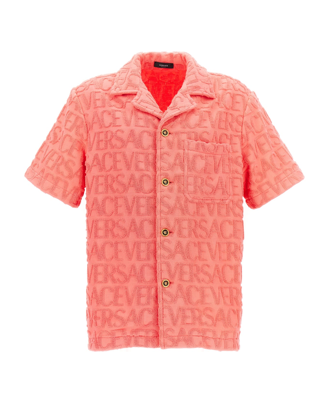 La Vacanza capsule cotton terry cloth shirt with 'Versace Allover' pattern, Medusa button closure, front pocket and short sleeves. Composition: 100% cotton
