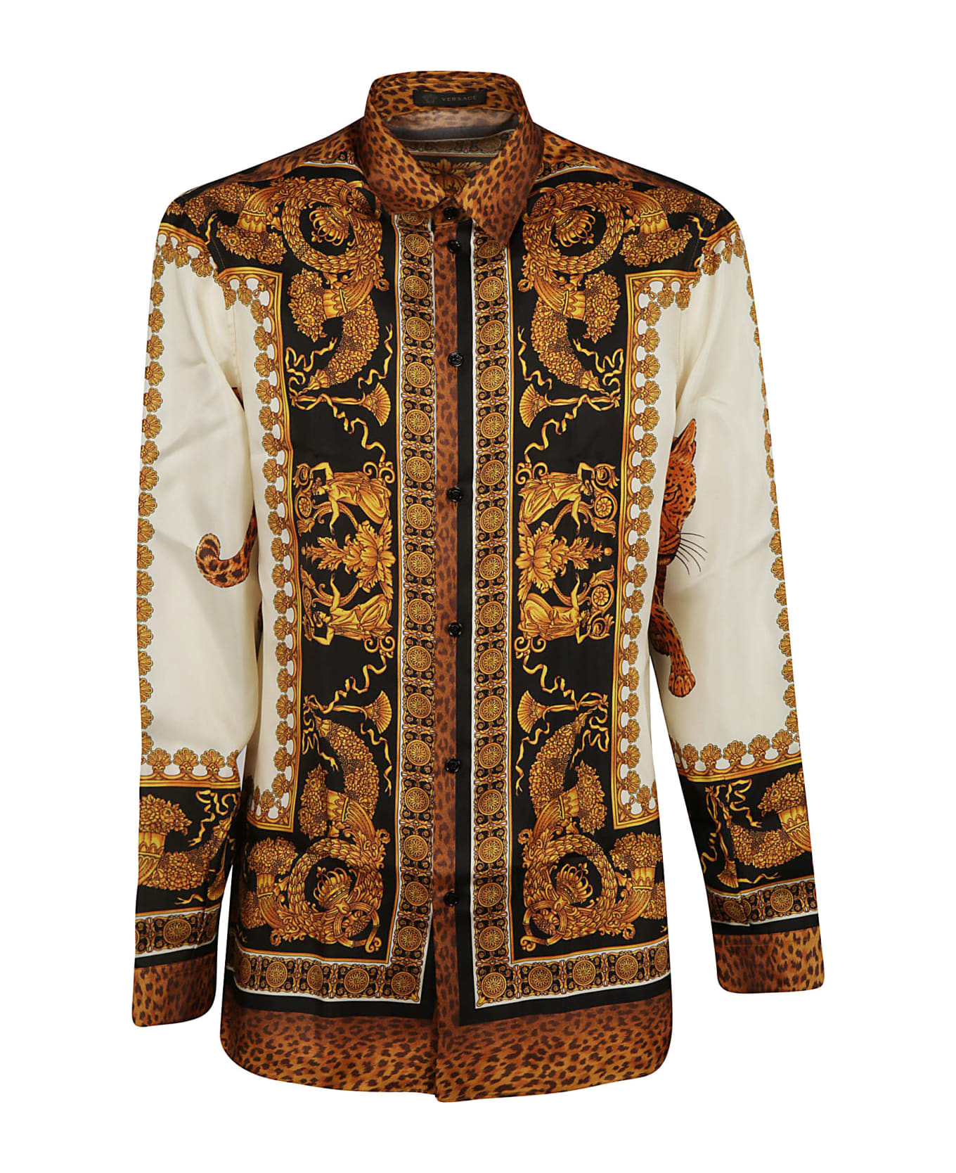 Leopard Print Shirt from Versace: Gold/Multicolor Leopard Print Shirt with classic collar, long sleeves, patterned print design, front button fastening and cuffs. Composition: 100% Silk