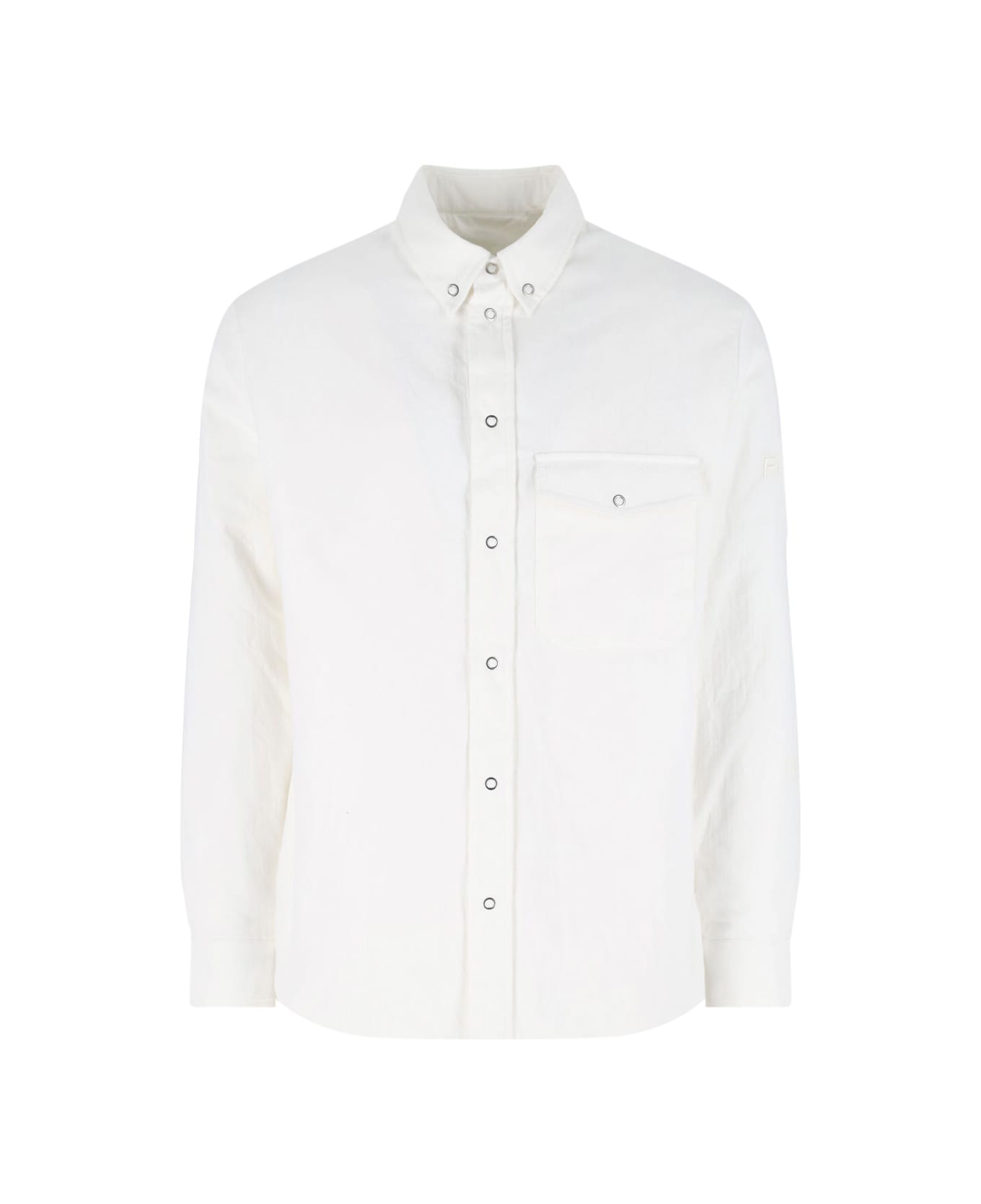 Moncler Genius X FRGMT padded shirt jacket in white cotton with button-down collar, button closure, button flap pocket on the chest, tone-on-tone logo embroidery on the sleeve, logo patch detail, button cuffs, curved hem.