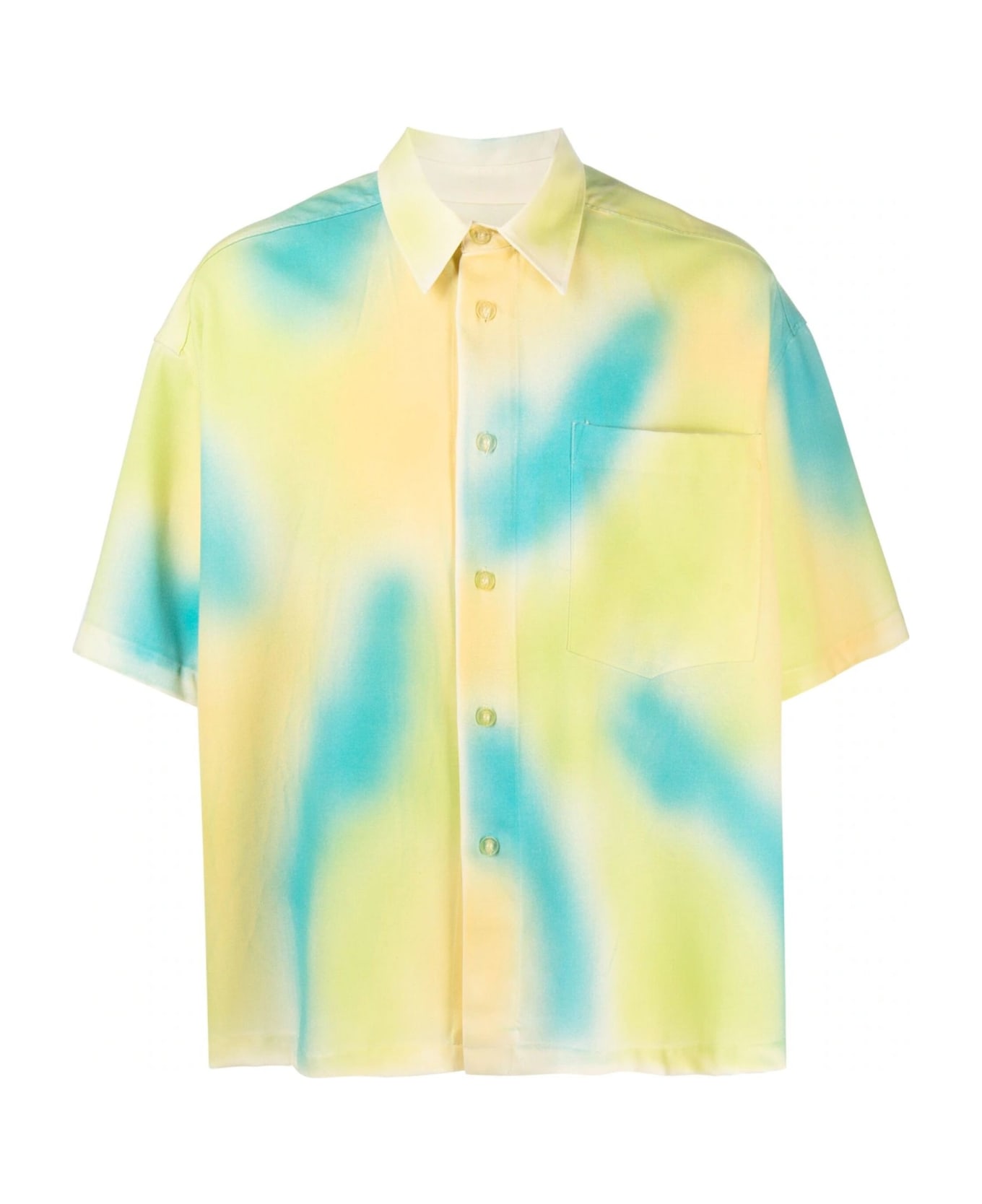 Yellow virgin wool blend shirt, abstract pattern print, classic collar, front button placket, short sleeves, straight hem