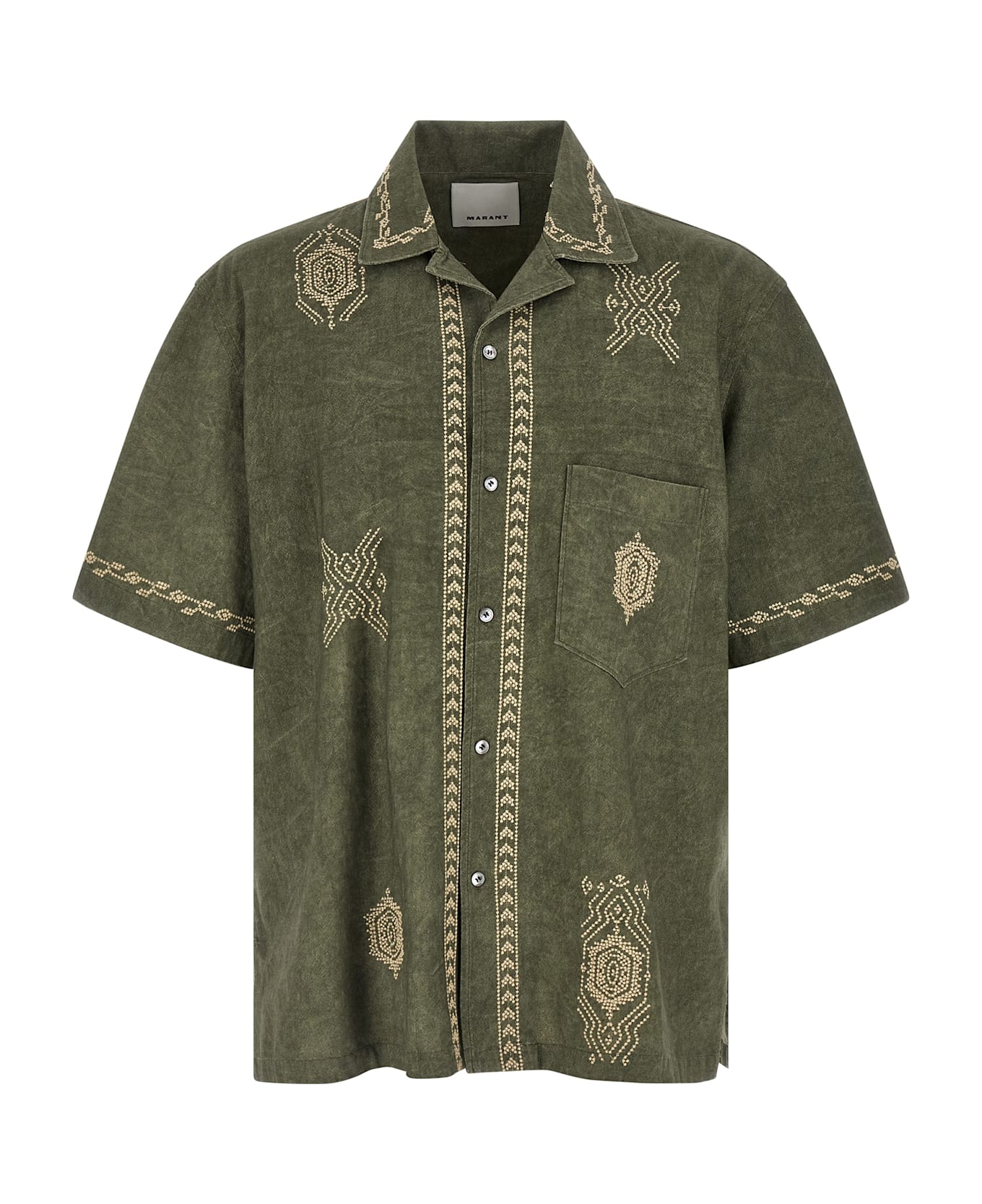 'Zekim' cotton gauze shirt with contrasting embroidery, bowling style, breast pocket, front button closure, short sleeves with dropped shoulders, side slits, asymmetrical hem. Composition: 100% cotton