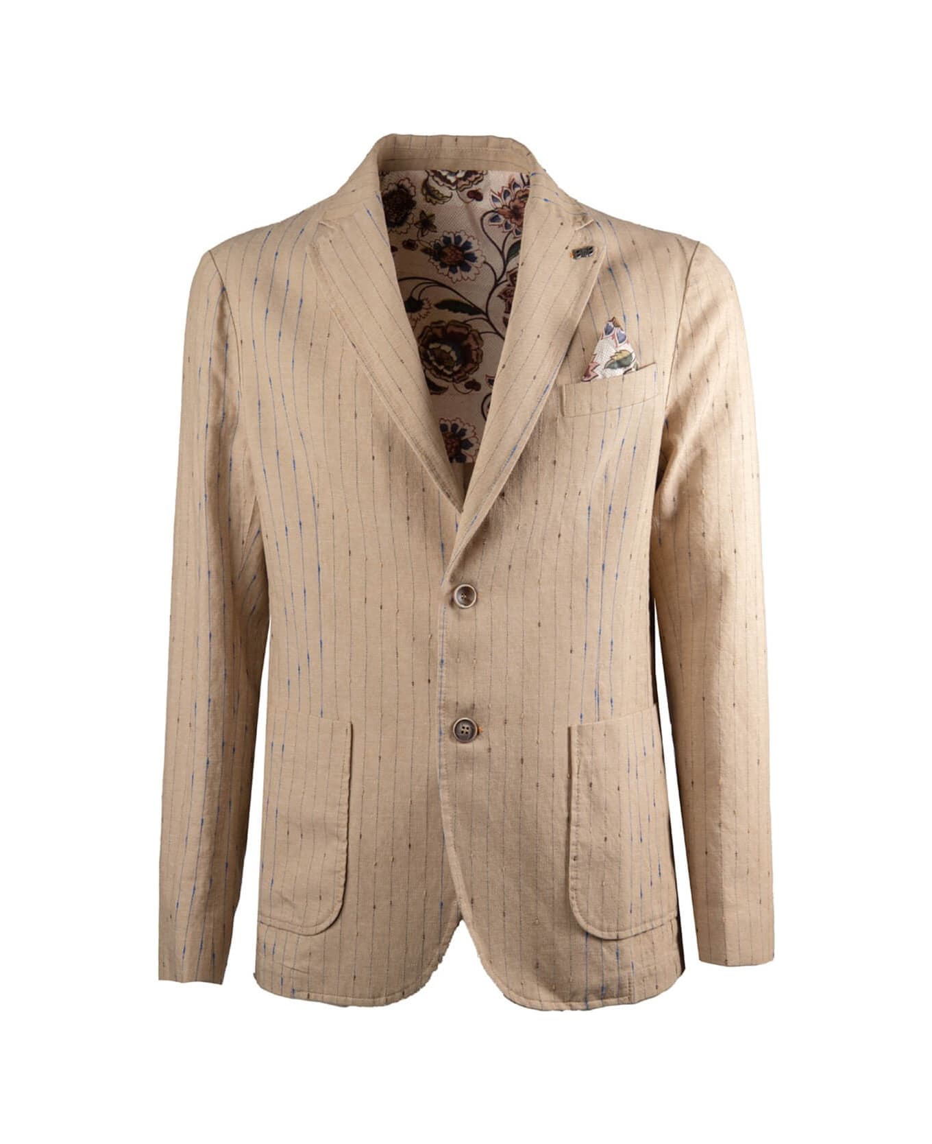 Bob David jacket made in cotton and linen in shades of beige with blue pinstripe pattern, featuring patch pockets on the front and welt pockets on the inside. Decorative handkerchief in tone with the inner lining, single-breasted closure with buttons and slits on the back. This item has a poor fit. We recommend purchasing one size larger than the usual one.