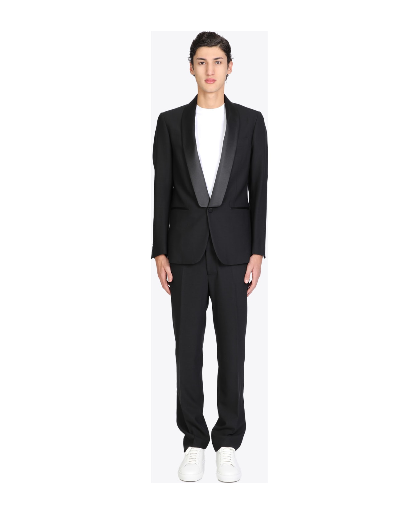 Black wool smoking suit. Blazer with satin rever and singl button closure. Two front pockets. Buttoned cuffs. Slim fit trousers with buttons closure. The model is 190 cm and wears size 48. Composition: 53% polyester 44% virgin wool 3% elastane. Made in Italy.