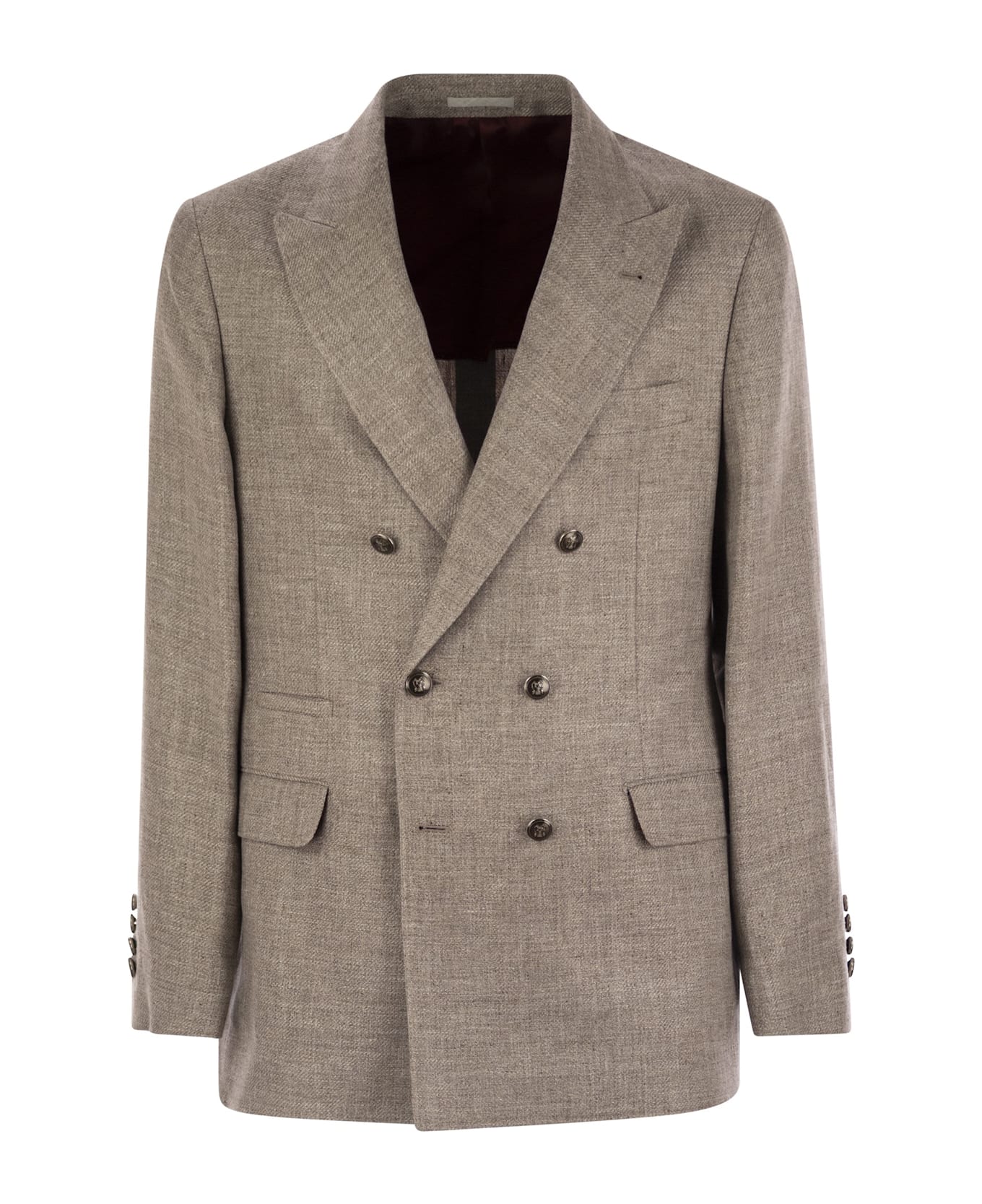 The fine Brunello Cucinelli yarns give charm and elegance to the contemporary silhouette of this deconstructed one-and-a-half-breasted jacket with peak lapels. The diagonal weave of the fabric enhances the natural properties of linen, wool and silk fibers, for a smooth and flowing hand and a characteristic slub texture that accentuates seasonal nuances. The "Solomeo Shoulder", named in honour of the village that houses the company, distinguishes the Brunello Cucinelli jacket with distinctive proportions. The slim and at the same time important shoulder line enhances the masculine physique, without the need for padding. - Six-button closure - Peak lapels - Welt pockets with flap, ticket pocket and chest pocket - Cuffs with four horn buttons and opening buttonholes - Two interior pockets with button closure and pen pocket -Lined - Double slit on the back - Drop 7 DESIGNER ID: MW4827BPD2 C2166