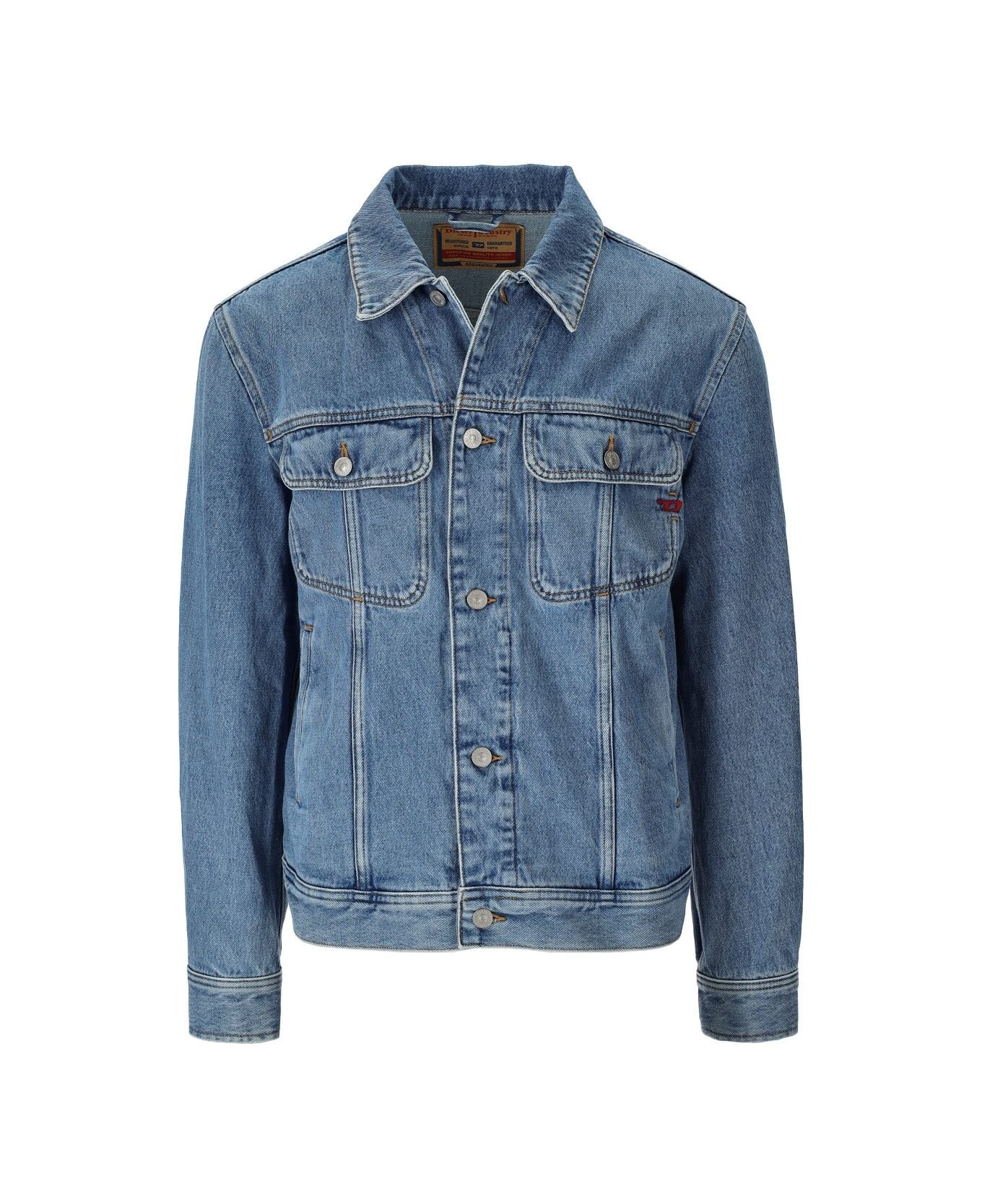 Diesel denim jacket made of light wash denim, featuring flap pockets and welt pockets on the front. Contrasting embroidered logo, buttons on the bottom to adjust the fit. Button closure. Composition: 100% cotton.