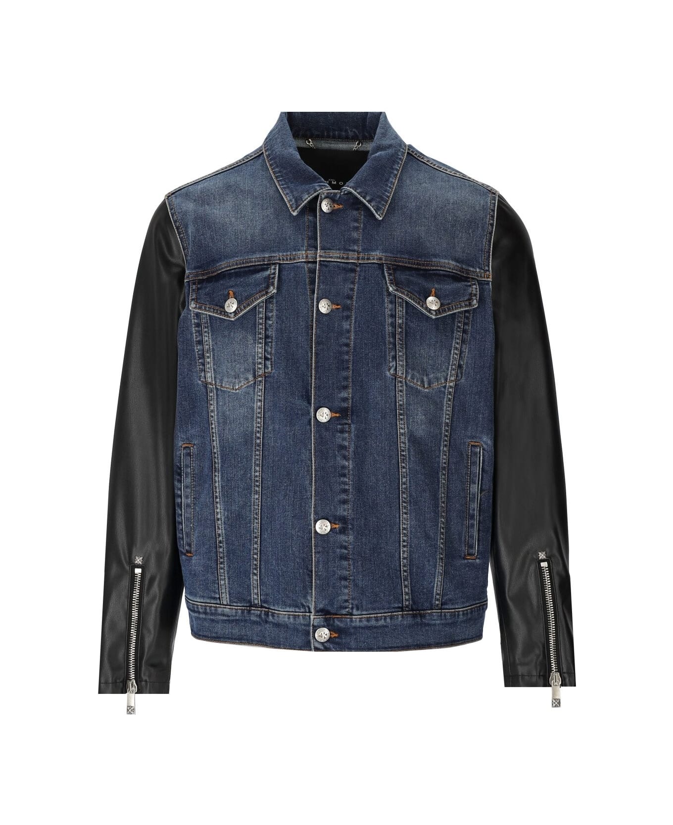 John Richmond jacket made of medium blue denim with leather effect sleeves. Flap pockets on the front, closure with logoed buttons and adjustable hem for a better fit. Composition: 99% cotton, 1% elastane.