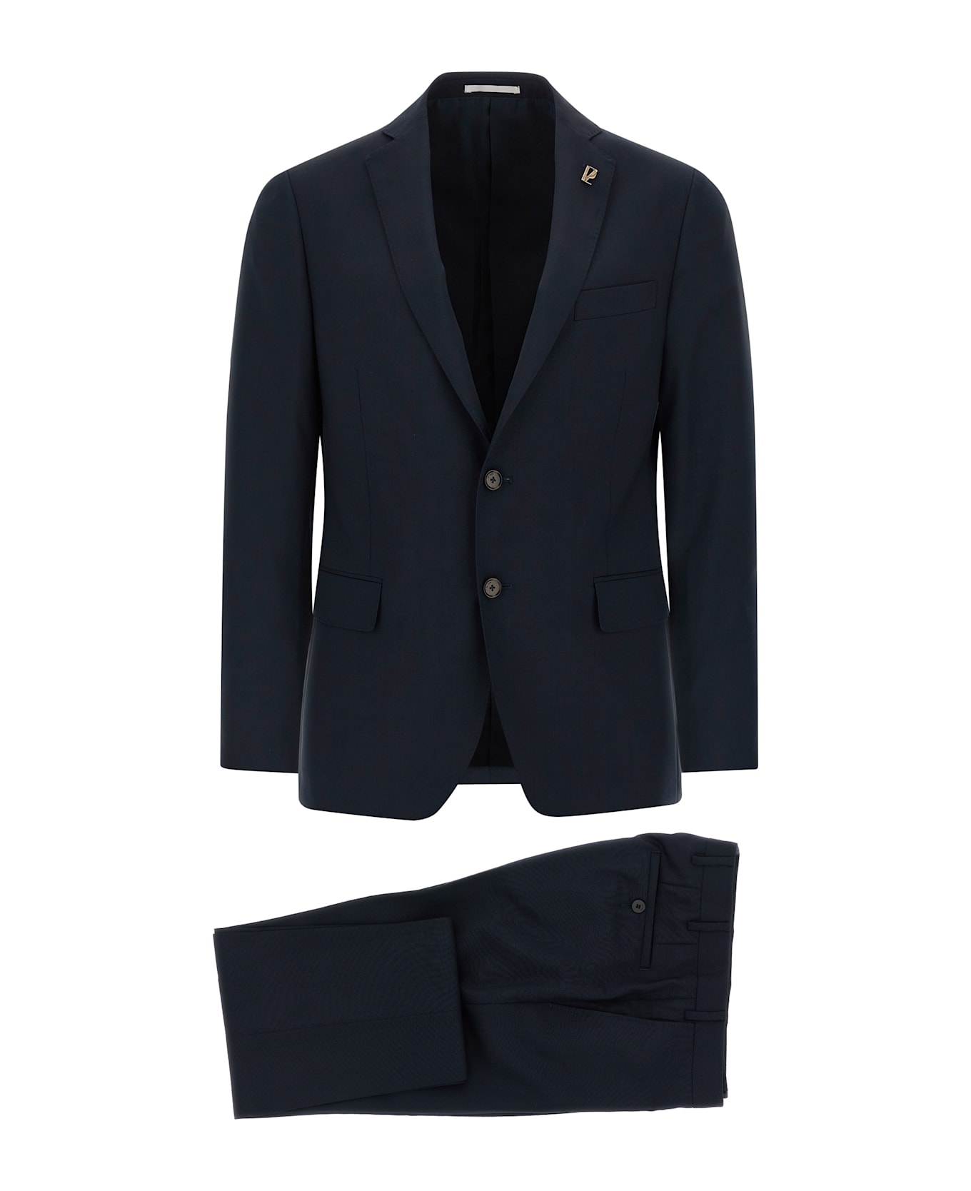 'Lord' cool wool dress consisting of single-breasted blazer with front button closure, mirror lapels with removable metal brooch, breast pocket, flap pockets, cupro lining, two inner pockets, cuffs with opening buttonholes, back slits and trousers with stretched crease, front pockets 'americane', back welt pockets, front zip and button closure, viscose lining.